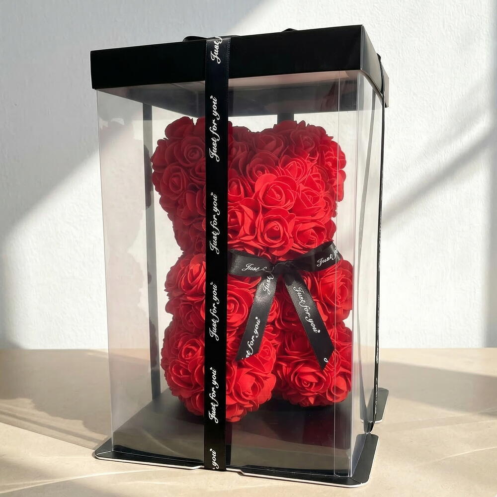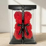 Цей милий ведмедик із червоних троянд — унікальний і чарівний варіант подарунка для тієї особливої людини. Виготовлений зі свіжих червоних троянд і упакований в елегантну коробку, цей подарунок символізує кохання та ніжність. Завдяки витонченому оформленню цей ведмедик стає ідеальним подарунком на річниці, День святого Валентина або будь-яку особливу нагоду. Рекомендації щодо догляду Щоб зберегти цього ведмедика з троянд у найкращому стані, рекомендується розміщувати його в прохолодному й сухому місці, уникаючи прямого сонячного світла та екстремальних температур. Поливати квіти не потрібно, оскільки троянди перебувають у відмінно збереженому стані. Просто насолоджуйтеся ним і тримайте подалі від вологи, щоб забезпечити довше збереження його краси.