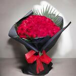 Цей приголомшливий букет червоних троянд символізує кохання та абсолютну відданість. Виготовлений зі 101 свіжої, насичено-червоної троянди, загорнутої в матовий чорний папір із зеленими акцентами та яскраво-червоною стрічкою, він ідеально підходить для сміливих освідчень у коханні та особливих святкувань.