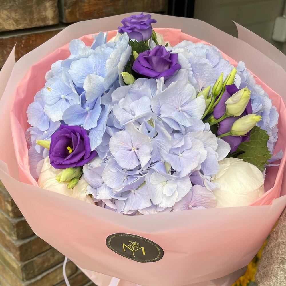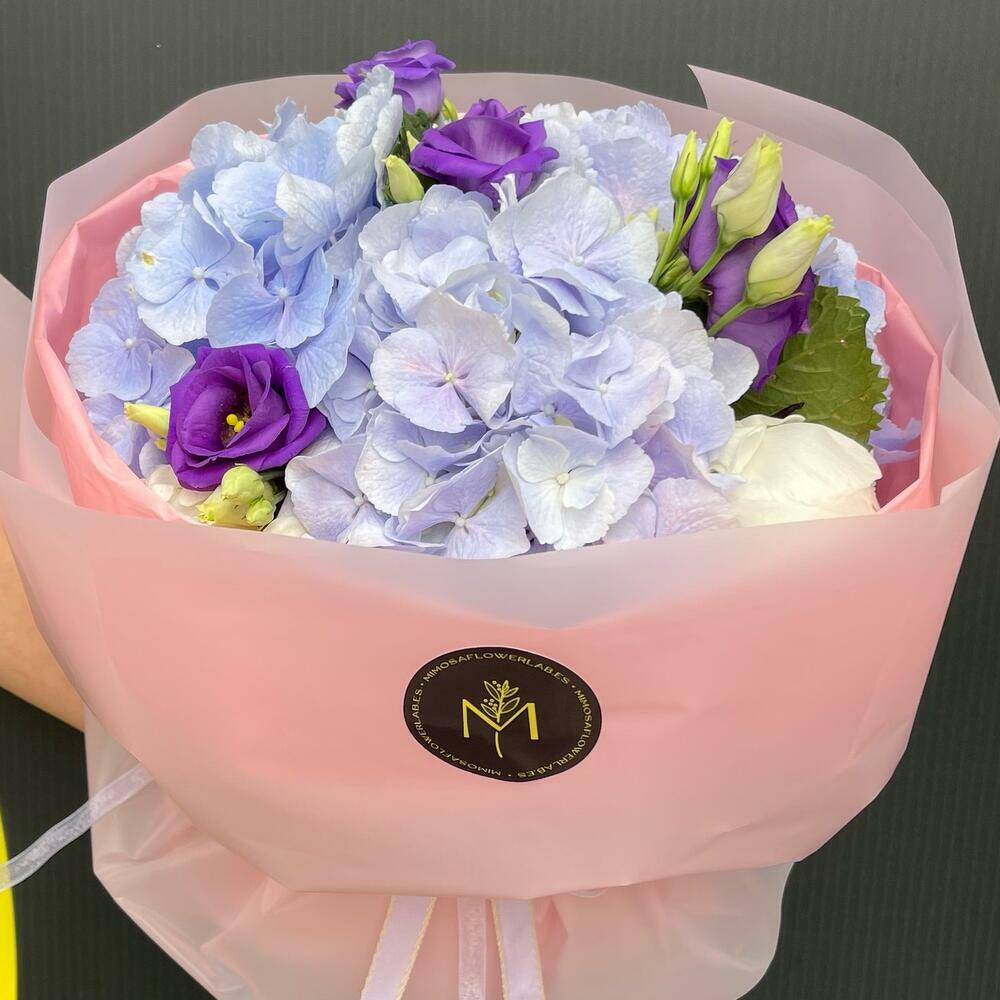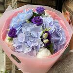 Ribbon - 2 шт. Lisianthus - 3 шт. packing paper - 3 шт. hydrangea blue - 3 шт. роза біла охара - 3 шт.