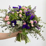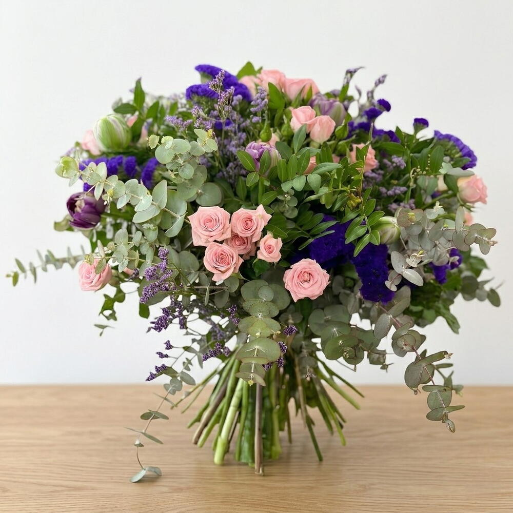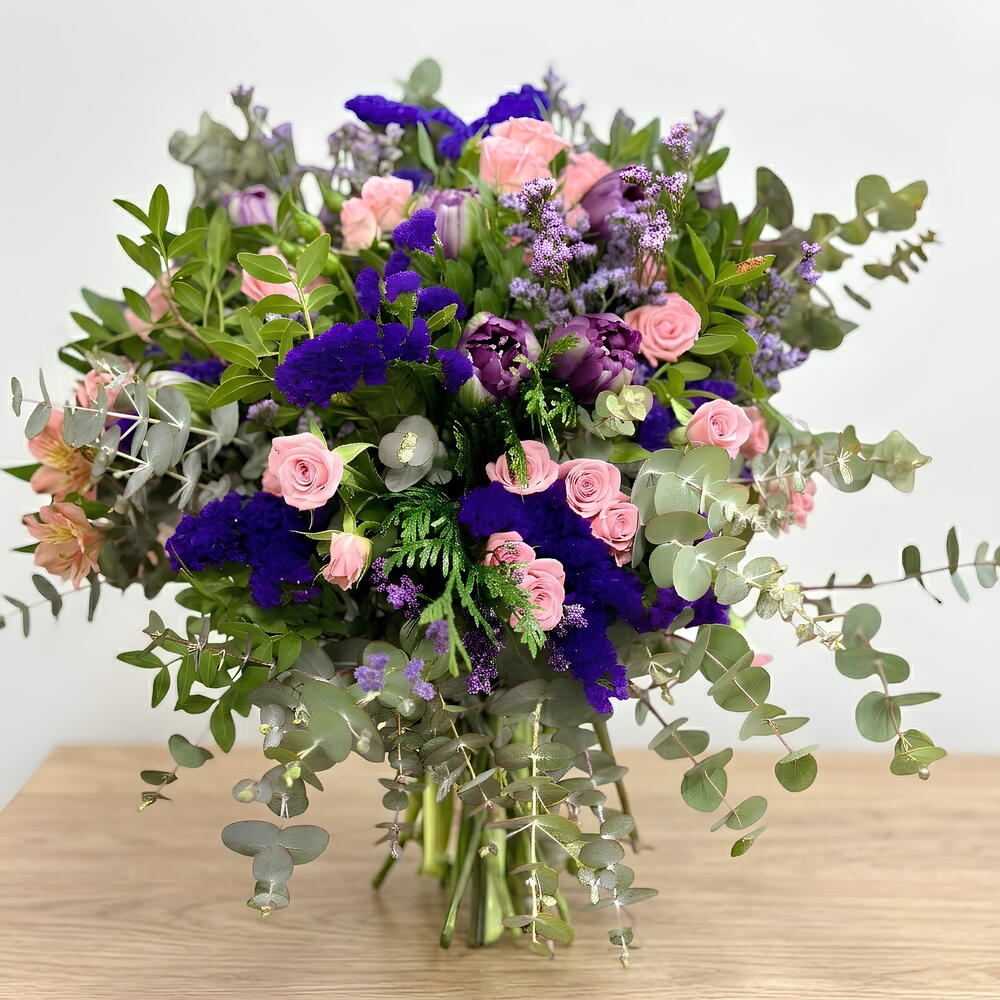 лентиски - 10 шт. рожеві міні-троянди - 5 шт. фіолетові лімоніуми - 5 шт. сезонний евкаліпт - 10 шт. лімоніуми фіолетові - 5 шт.