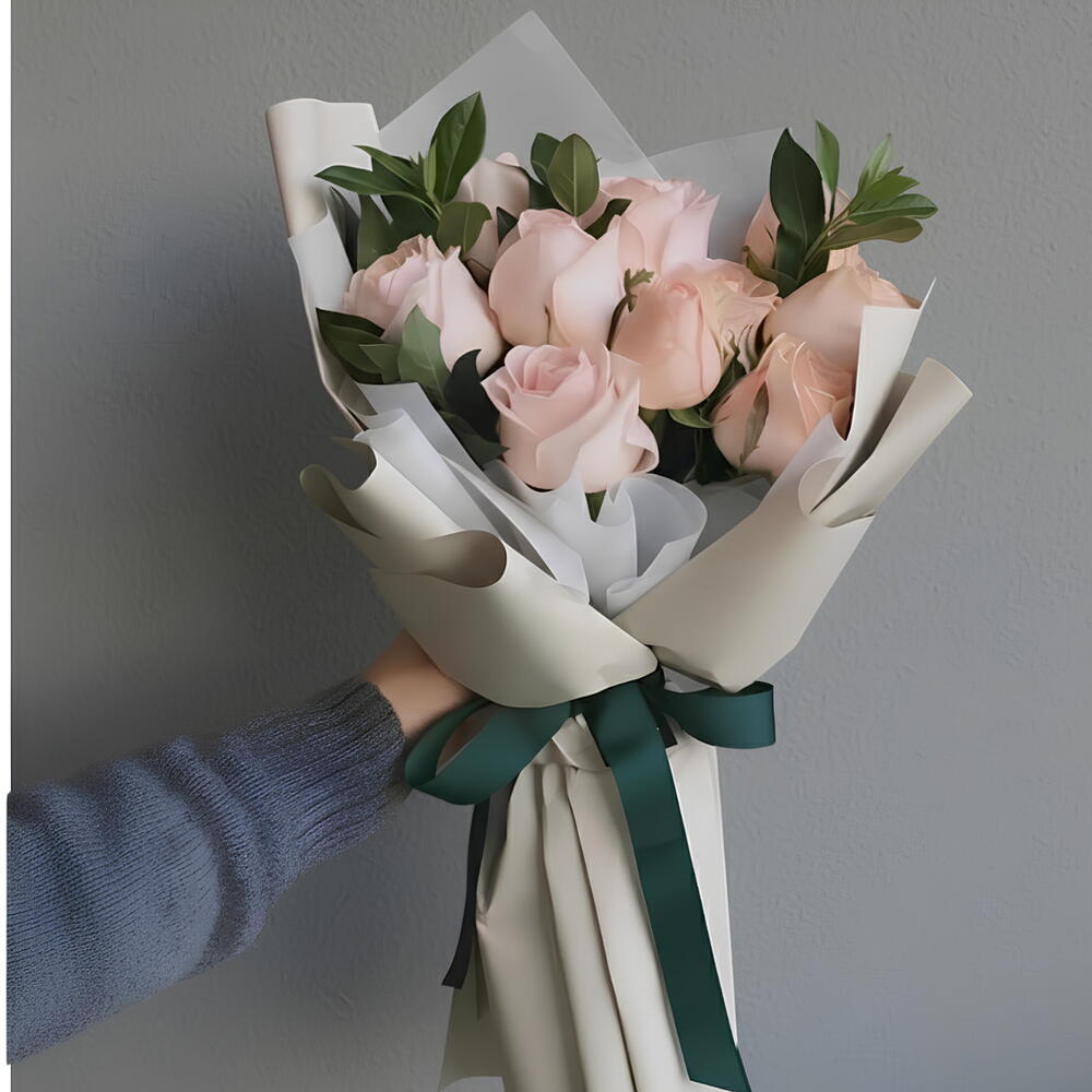 Елегантний букет троянд ніжного нюдового відтінку, оформлений у сучасному та вишуканому стилі, який підкреслює м'якість і чистоту квітів. Ця мінімалістична композиція поєднує троянди з оксамитовим виглядом із різноманітною зеленню, що надає свіжості та природної структури. Загорнутий у папір з матовою фактурою і завершений декоративною стрічкою глибокого зеленого кольору, цей букет квітів для подарунка ідеально підходить як квіти для жінки, букет на день народження, ексклюзивний букет або романтична квіткова композиція. Вишукана пропозиція сучасного квіткового декору і квітів для особливої нагоди, яка передає спокій, елегантність і хороший смак.