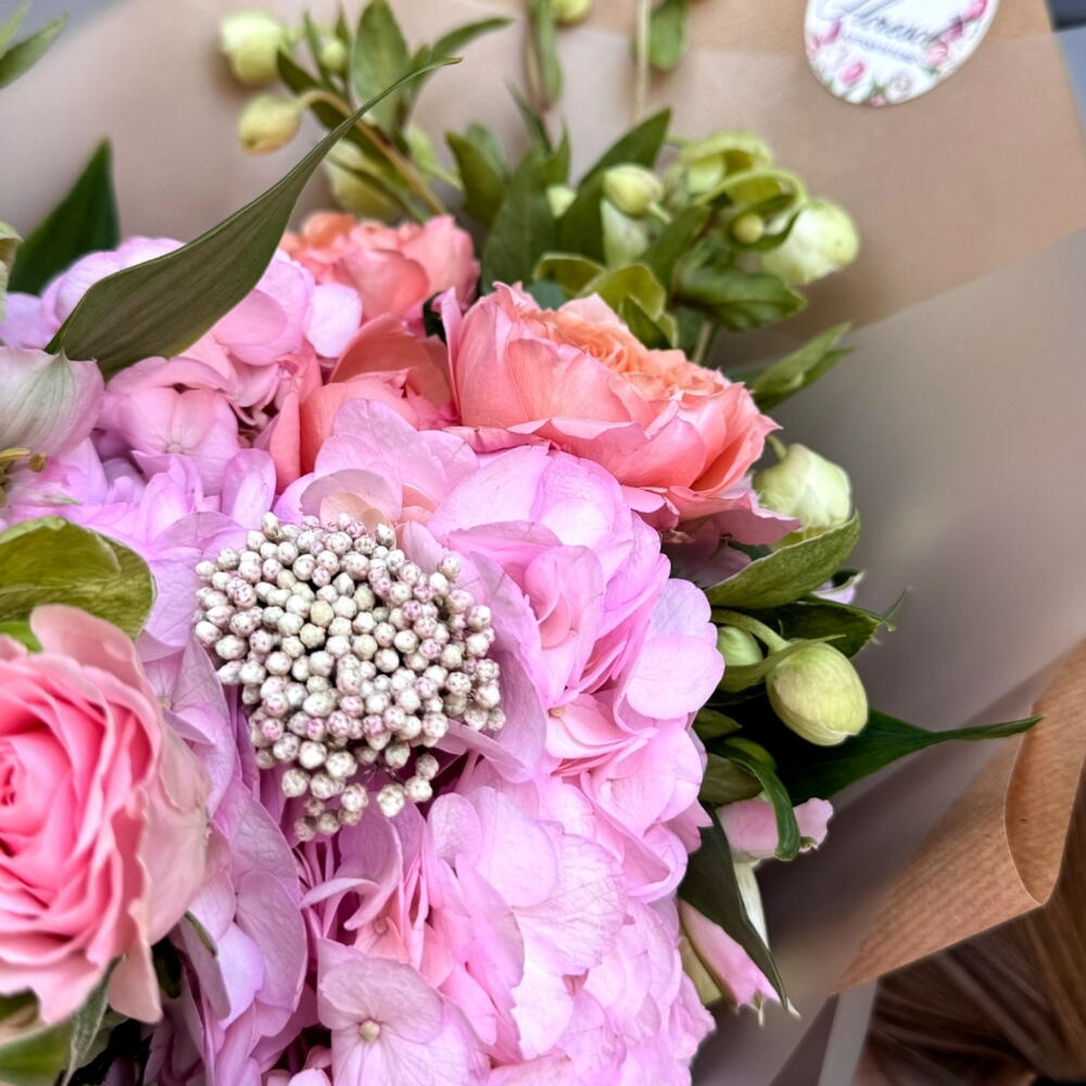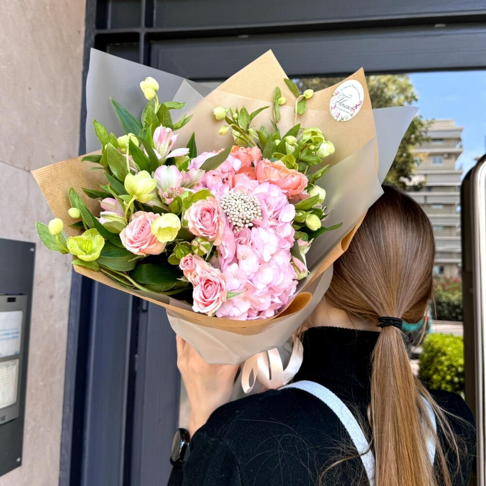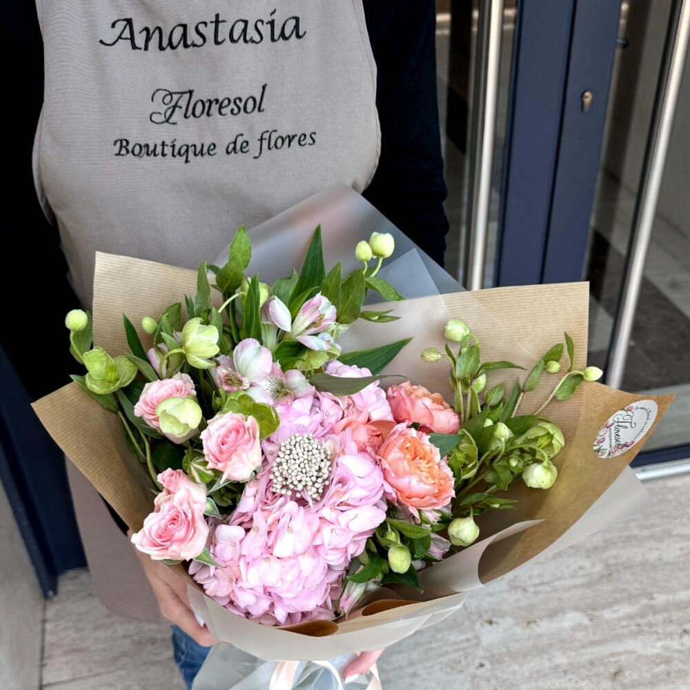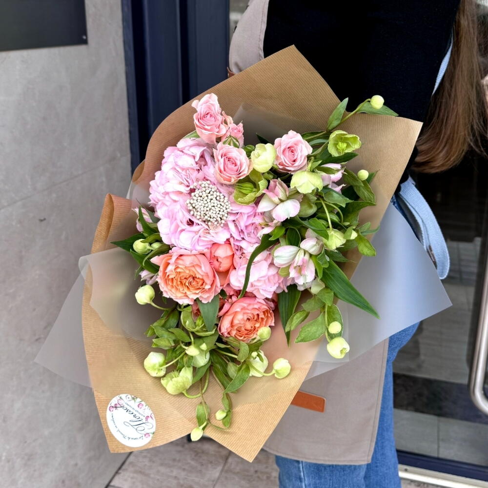 Alstroemeria - 2 шт. hortensia - 1 шт. чемерник - 3 шт. rosa ramificada - 1 шт. квітка рису - 1 шт. роза джуллієта - 1 шт.