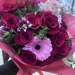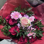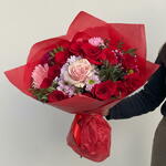 Вишуканий букет червоних троянд у поєднанні з ніжними квітами в рожевих та лілових тонах, загорнутий у насичений червоний папір. Дизайн, сповнений пристрасті та елегантності, ідеально підходить, щоб висловити любов, захоплення та створити незабутні моменти.