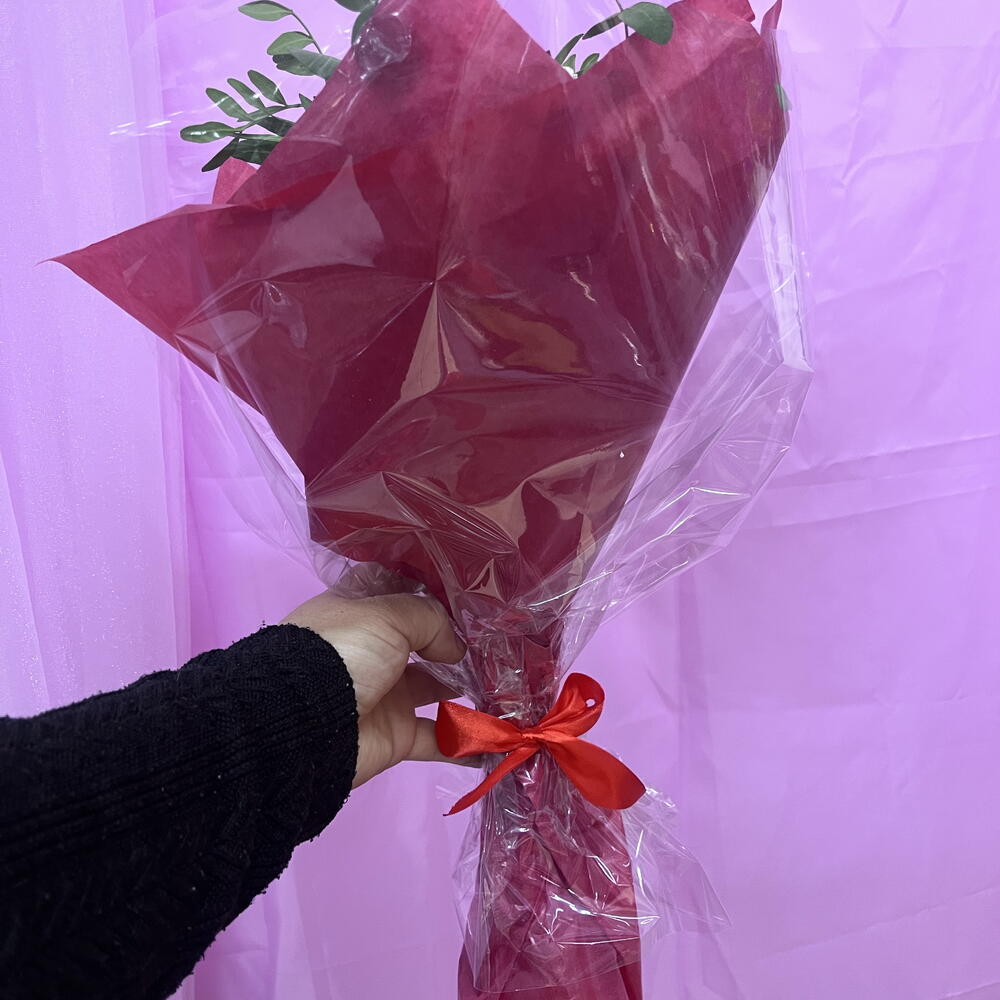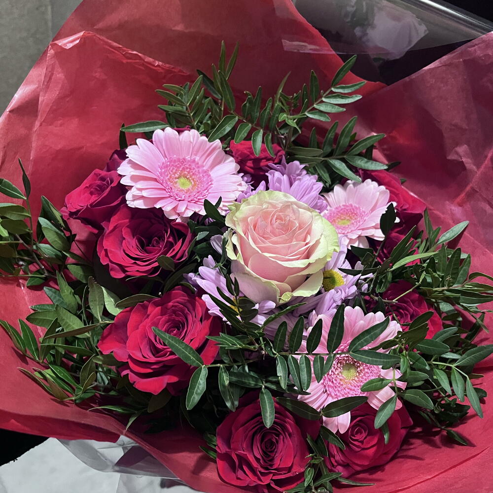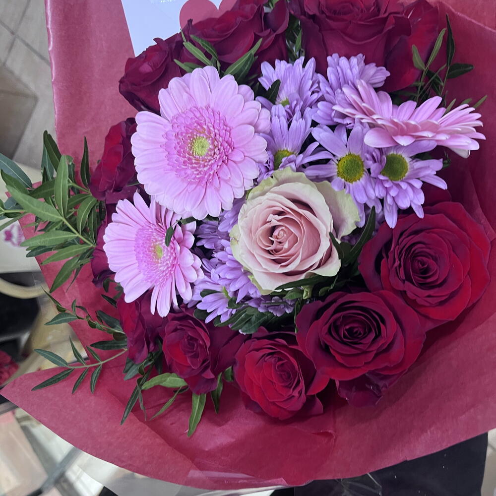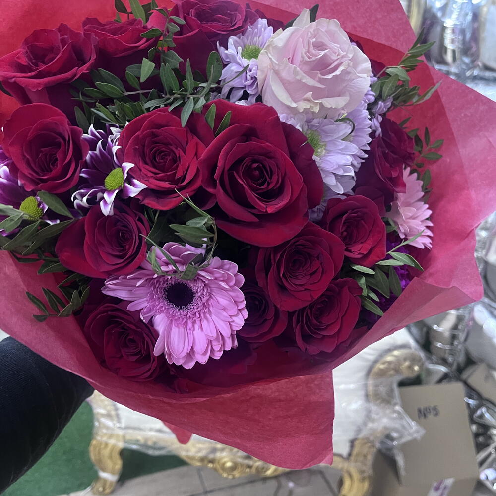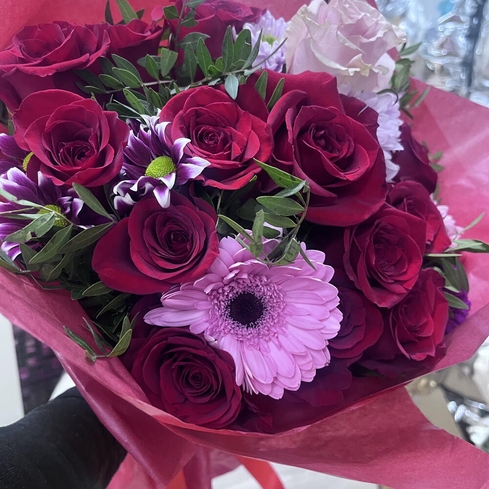 Вишуканий букет червоних троянд у поєднанні з ніжними квітами в рожевих та лілових тонах, загорнутий у насичений червоний папір. Дизайн, сповнений пристрасті та елегантності, ідеально підходить, щоб висловити любов, захоплення та створити незабутні моменти.
