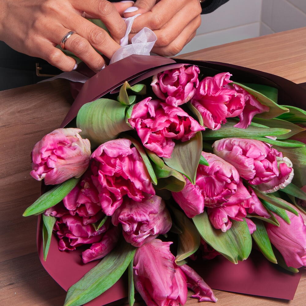 корейський папір - 1 шт. декоративна стрічка - 1 шт. тюльпани (відтінок може відрізнятися) - 20 шт.