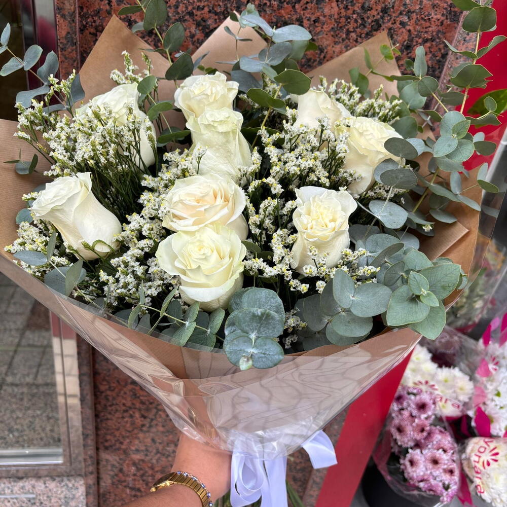 Limonium - 5 шт. евкаліпт - 9 шт. троянди mondial - 9 шт.