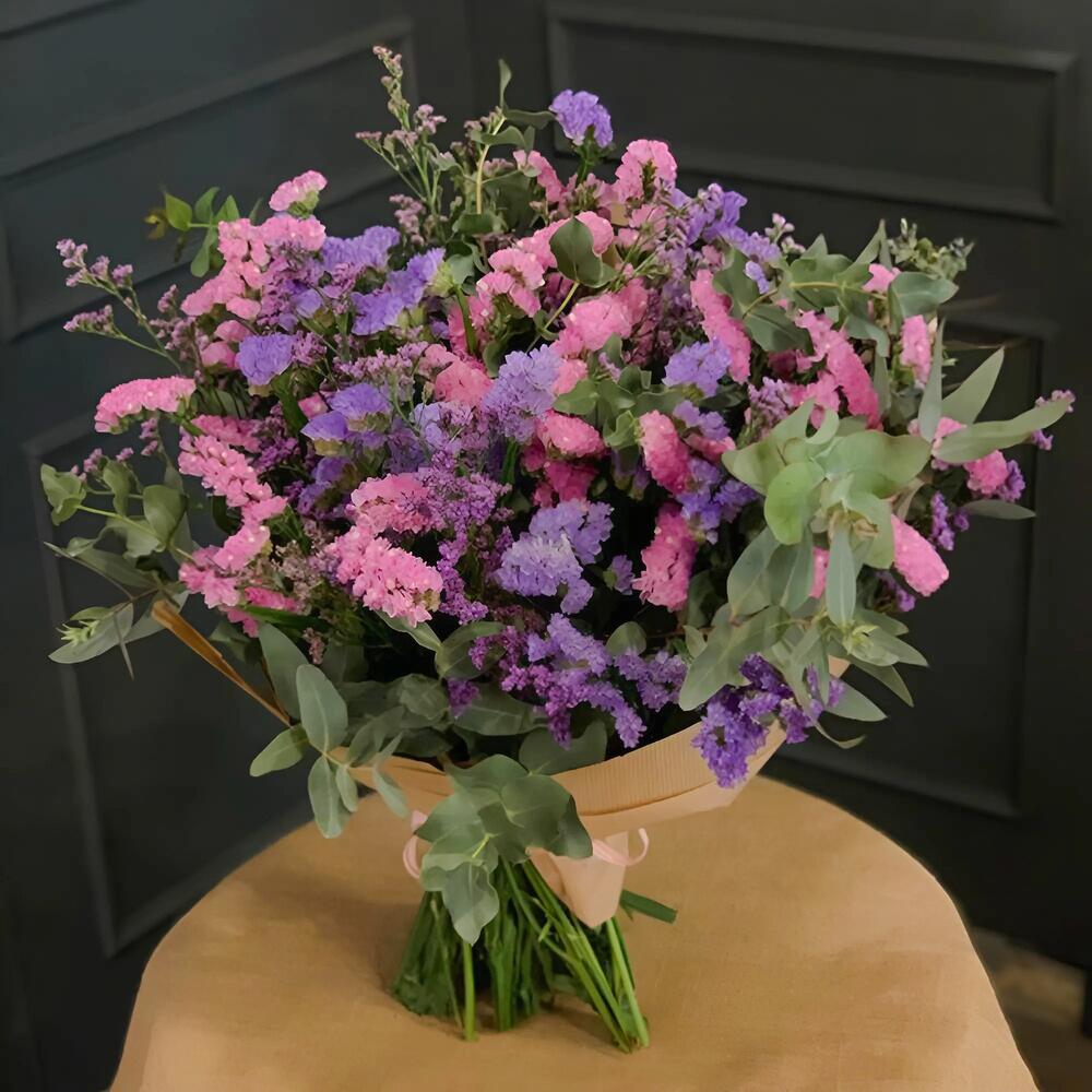 Букет «Claudina» від Nerine arte floral — це вибух кольору та природності. Його ніжне поєднання фіолетових і рожевих відтінків у гармонії з м'якою зеленню евкаліпта та лентиска робить його чарівним і універсальним варіантом. Ідеально підходить для подарунка, прикрашення простору або просто щоб підняти настрій. Цей букет ручної роботи вирізняється свіжістю та візуальною легкістю. Статіце, також відоме як паперова квітка, ідеально підходить через свою довговічність, а листя евкаліпта та лентиска додає структури, об'єму та ніжного аромату. Щоб продовжити життя букета, помістіть його у вазу зі свіжою водою, подалі від прямих джерел сонячного світла або тепла. Змінюйте воду кожні два дні і зрізайте стебла трохи під кутом при цьому. Так ви зможете довше насолоджуватися його природною красою.