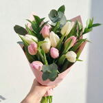 різні зелені - 5 шт. тюльпани рожево-білі - 10 шт.