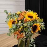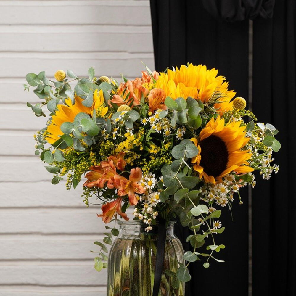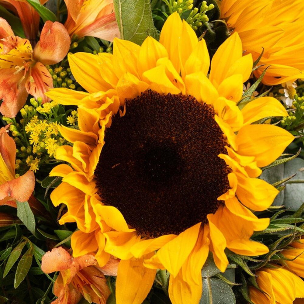 помаранчева альстромерія - 4 шт. золотарник жовтий - 3 шт. свіжий евкаліпт - 4 шт. декоративне зелене листя - 3 шт. свіжі соняшники - 3 шт.