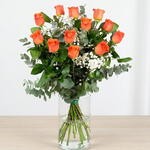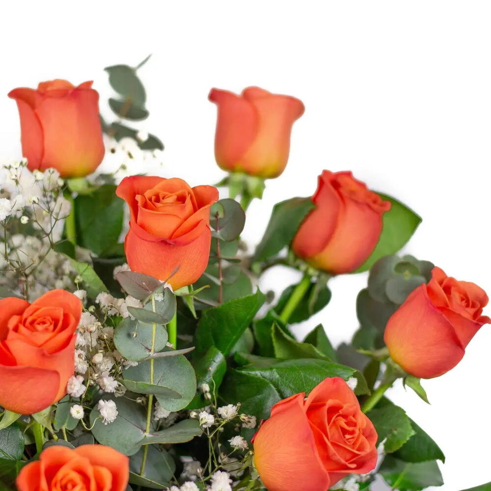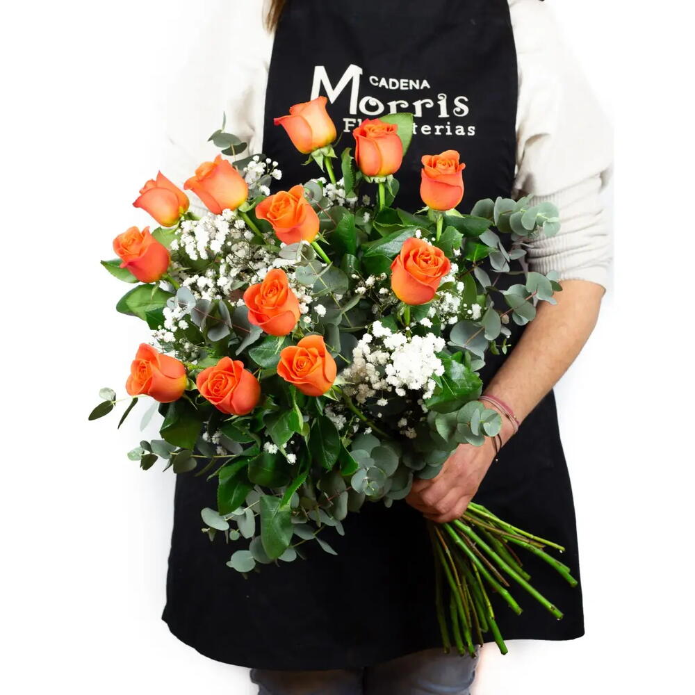 Un vibrante ramo de 17 rosas naranjas de tallo largo y flor grande, acompañado de delicada gypsophila que realza su frescura y colorido. Su tono naranja transmite entusiasmo, alegría y energía positiva, convirtiéndolo en el regalo ideal para sorprender y llenar de vida cualquier ocasión especial. 🧡🌿