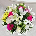білий лізіантус - 2 шт. біла орієнтальна лілія - 2 шт. золотарник жовтий - 1 шт. зелена калина - 2 шт. різноманітні маргаритки - 1 шт. Гербера (в тонах фуксії та рожевого) - 2 шт. насичено-рожеві троянди - 3 шт.
