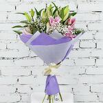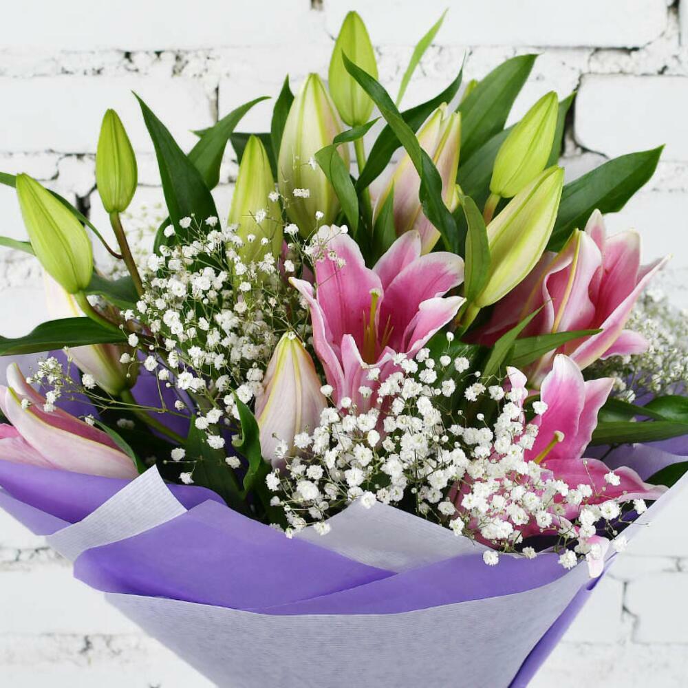 Цей букет — справжнє втілення елегантності та кольору. Три великі рожеві лілії розкриваються серед тонкої хмаринки гіпсофіли, створюючи відчуття легкості та грації. Дизайнерська упаковка фіолетового кольору підкреслює насичені тони й робить квіткову композицію особливо помітною. Ідеальний вибір, щоб здивувати когось особливого.