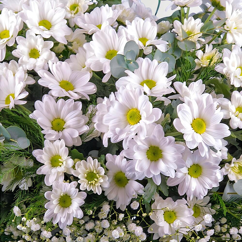 Букет свіжих квітів у білих тонах Квіти : білі маргаритки, панікулата та різні види зелені.