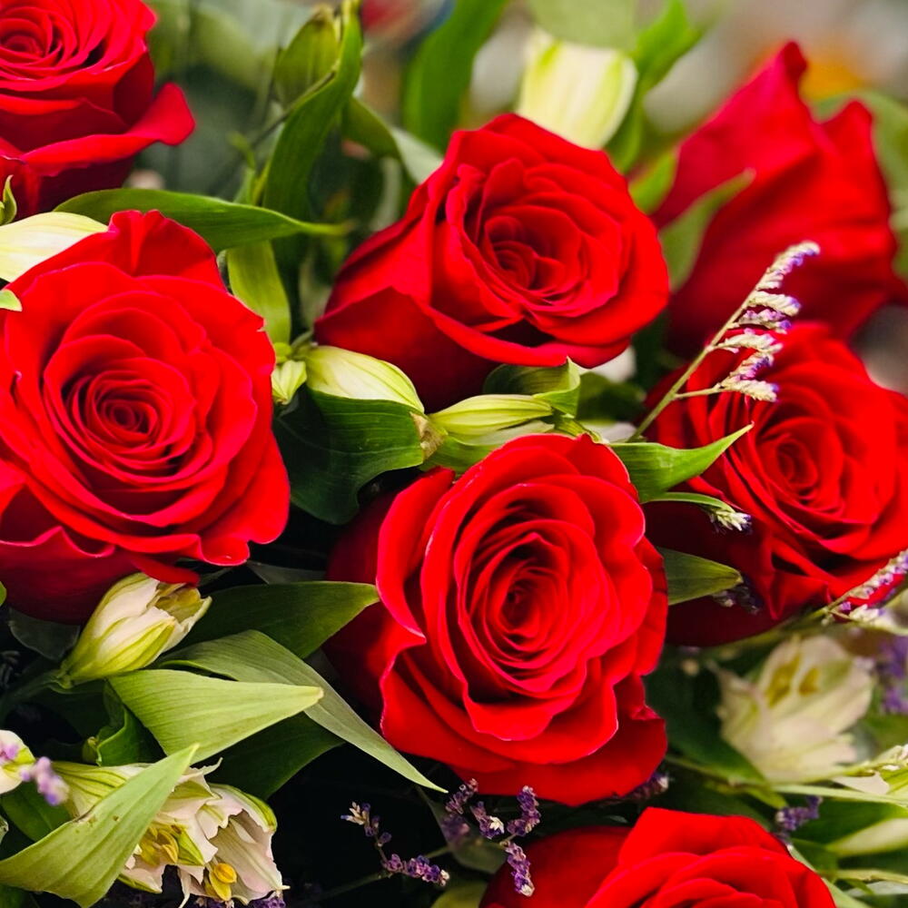 Букет з червоних троянд, іноді квіткові букети можуть прибути в пункт призначення з квітами іншого кольору або сорту, ніж на фотографії, в залежності від наявності.