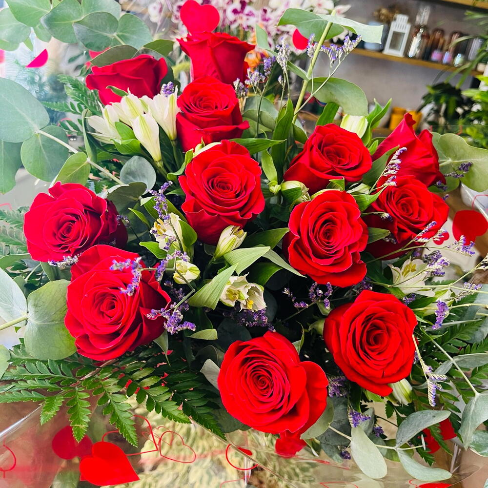 Eucalyptus - 3 шт. Alstroemeria - 5 шт. rosas rojas - 12 шт. папороть - 6 шт. лімоніум ліловий - 5 шт.