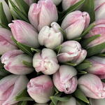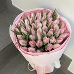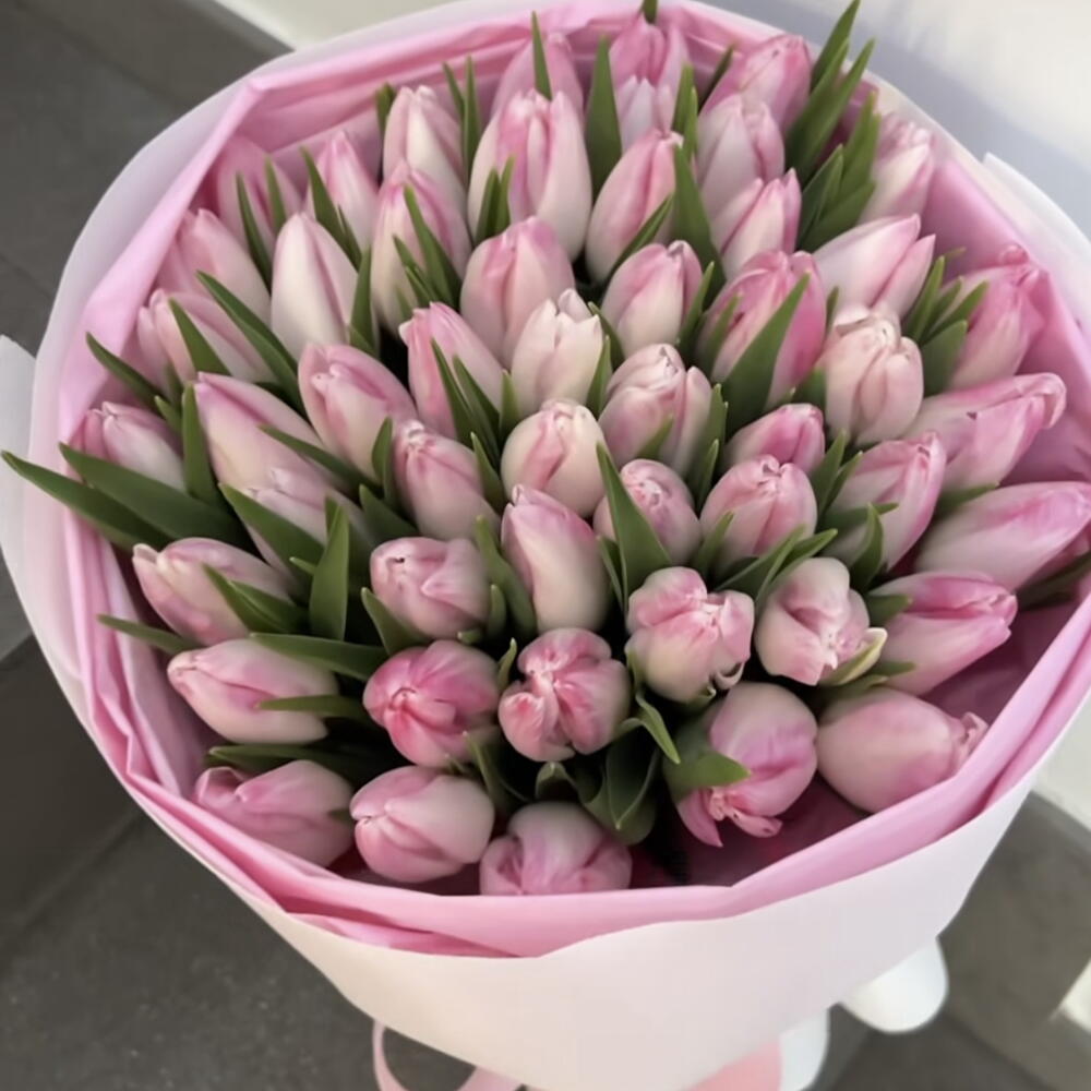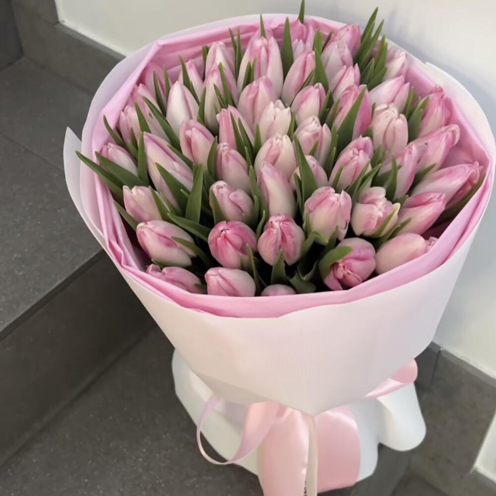 Опис для онлайн-продажу: Елегантний букет, складений приблизно з 50 свіжих рожевих тюльпанів, ретельно відібраних за м’яким і рівномірним відтінком. Тюльпани супроводжуються своїм природним зеленим листям, створюючи ніжний та гармонійний контраст. Аранжування загорнуте в корейський папір у пастельних рожевих тонах з вишуканим оздобленням і декоративною стрічкою, ідеально підходить для подарунка з нагоди особливих подій, таких як дні народження, річниці, народження дитини або романтичні знаки уваги. Деталі товару: • 🌷 Тип квітки: натуральний тюльпан • 🎨 Колір: ніжно-рожевий • 🔢 Кількість: ~50 стебел • 🎁 Презентація: преміальна обгортка рожевого кольору • 📏 Орієнтовна висота букету: 35–40 см • 🌿 Включає натуральне листя Ідеально для: романтичних подарунків, привітань, подяк або елегантного декору.