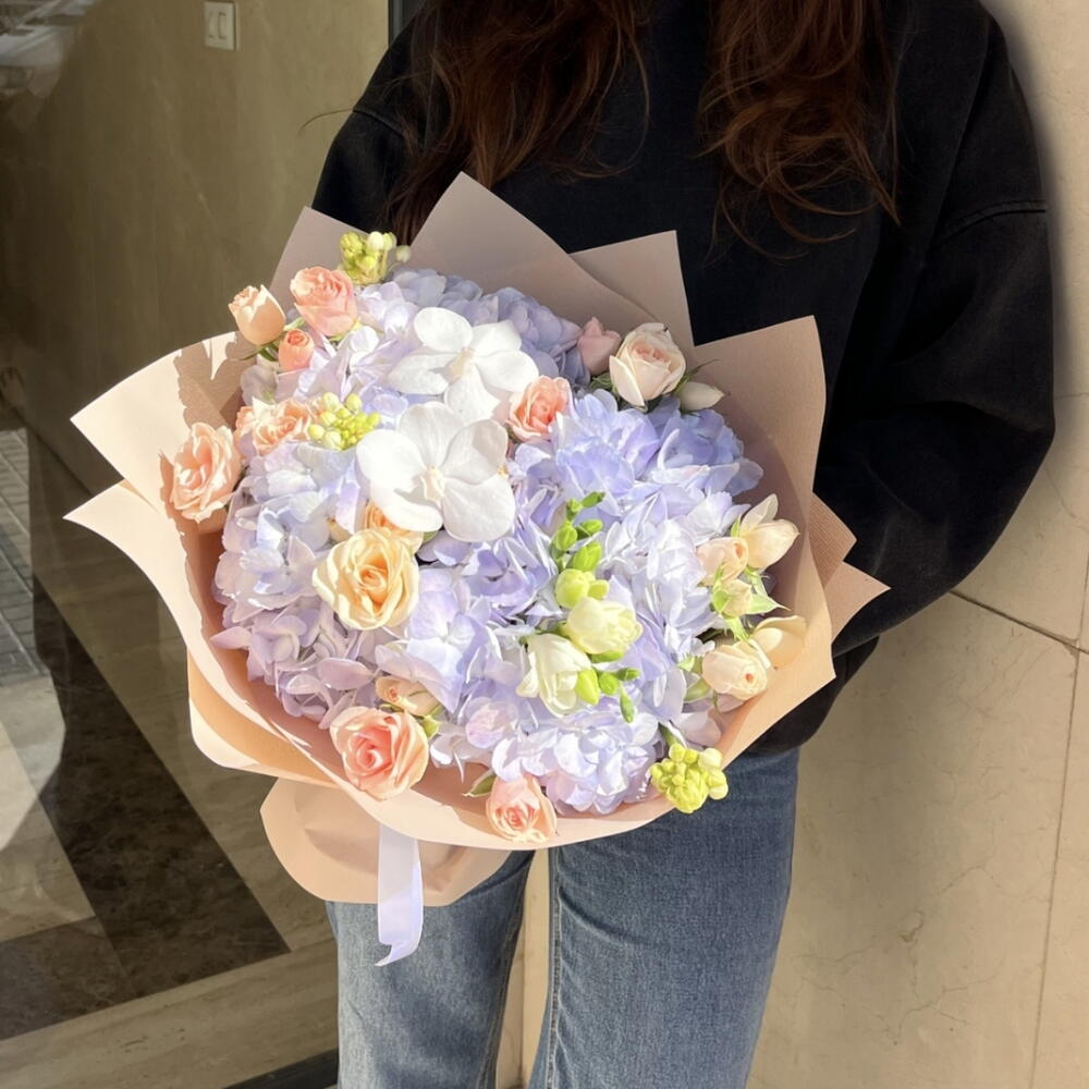 Ornithogalum - 2 шт. Spray rose - 8 шт. hortensia - 4 шт. fresia - 2 шт. орхідея ванда - 2 шт. папір - 4 шт.