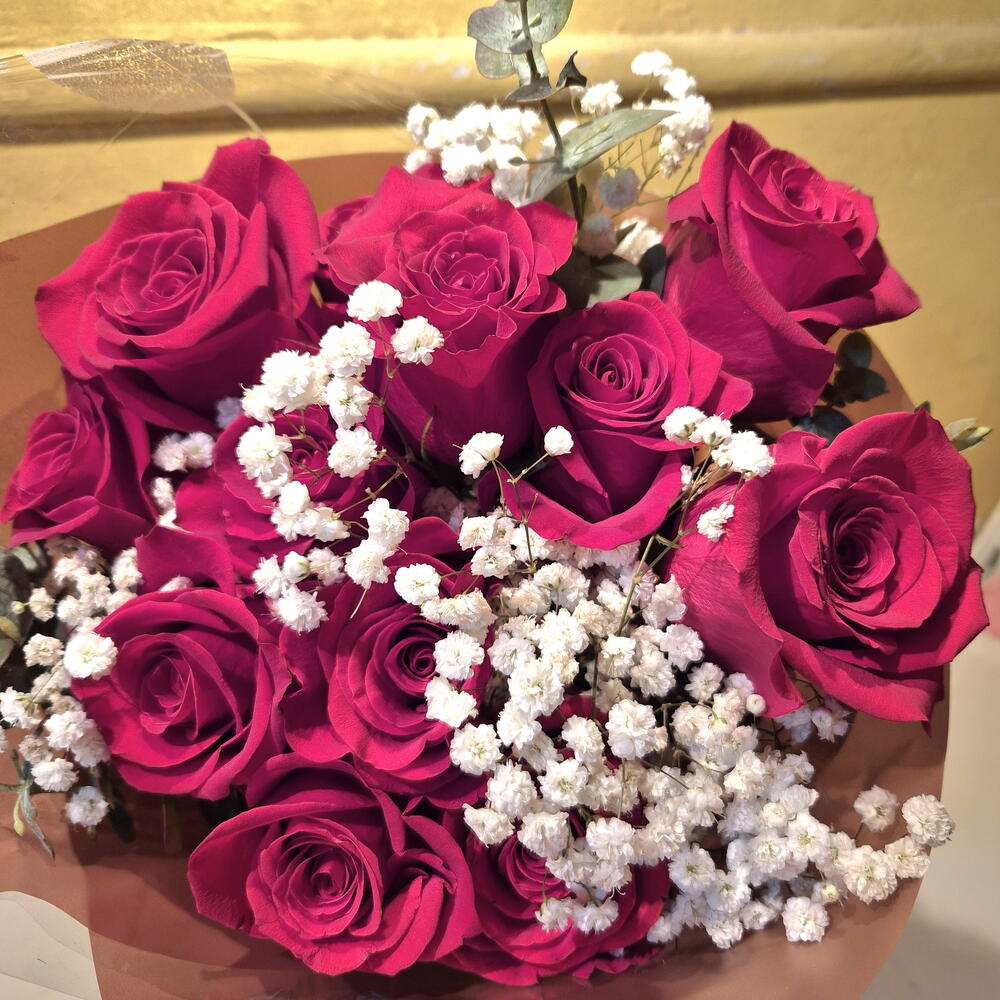 Букет із дванадцяти червоних троянд з гібридом бебі-дихання та евкаліптом цинереєю – це найвище втілення вічного кохання, досконалості та захисту. Компоненти та символіка 12 червоних троянд: Вони символізують повне та безумовне кохання. Число дванадцять уособлює повноту; дарувати десяток означає «будь моїм» або «Я думаю про тебе 12 місяців на рік». Гібрид бебі-дихання (фата): Додає нотку невинності, чистоти та ніжності. Його маленькі білі квіти підсилюють інтенсивність червоних троянд, символізуючи щирість почуттів. Евкаліпт цинерея: Додає значення очищення, захисту та оновлення. Його синьо-зелене листя пропонує розслаблюючий аромат та елегантну структуру, що символізує стабільність та мир у стосунках. Цей дизайн – позачасова класика, ідеально підходить для річниць, пропозицій або для вираження глибокої відданості.