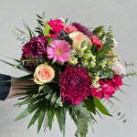 Ramo floral lleno de carácter y elegancia, donde se combinan intensos tonos burdeos, rosa y crema. Las delicadas rosas se integran con crisantemos voluminosos, una vibrante gerbera central y suaves claveles, creando una композиция rica en текстuras y contrastes. Los pequeños detalles de manzanilla y el toque fresco del eucalipto aportan ligereza y naturalidad, equilibrando perfectamente la intensidad de los colores. Perfecto para ella, para una chica, para una amiga o para alguien especial. Ideal en regalo, para cumpleaños, para aniversario, para sorprender, para demostrar cariño o como detalle elegante y original. Una excelente opción si buscas ramo de flores en tonos rosa y burdeos, bouquet elegante y moderno, flores para regalo femenino, arreglo floral llamativo, ramo bonito con contraste de colores o flores con entrega a domicilio. 🌸✨