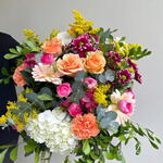 Барвистий та яскравий квітковий букет, натхненний садом, що вирує життям, з ніжними персиковими трояндами, насиченою фуксією ранункулюс та ніжною білою гортензією. Його доповнюють гербери, гвоздики та хризантеми, а також нотки жовтого солідаго, що додають світла та енергії. Поєднання теплих та холодних тонів створює динамічну композицію, яка передає радість, оптимізм та життєву силу — ідеально підходить для підняття настрою та здивування когось подарунком, повним квітів та індивідуальності. Ідеально підходить для неї, подруги, мами чи когось особливого. Чудово підходить як подарунок на день народження, святкування, для вираження подяки або для прикраси простору природним та життєрадісним дотиком. Чудовий вибір, якщо ви шукаєте барвистий та сучасний букет, квіти з трояндами та гортензією, життєрадісний та сяючий букет, квіти для подарунка зі свіжим стилем або квіткову композицію, повну енергії, квітів та природного шарму. 🌸🌼✨