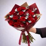 Цей елегантний класичний букет поєднує в собі насичений колір та пристрасть 25 справжніх червоних троянд зі свіжістю та ароматом 14 гілок евкаліпта. Додавання 8 червоних рускусів додає завершального штриха вишуканості та елегантності. Ідеально підходить для особливих моментів або просто для того, щоб скрасити будь-який день. Зверніть увагу, що хоча ми докладаємо всіх зусиль, щоб знайти точні інгредієнти, іноді нашим флористам може знадобитися замінити квітку аналогічною. Кожен букет Qantu Quality Flowers розроблений та виготовлений вручну в нашій майстерні з використанням найкращих квітів від перевірених виробників та постачальників. Ваш букет буде доставлено в подарунковій упаковці.