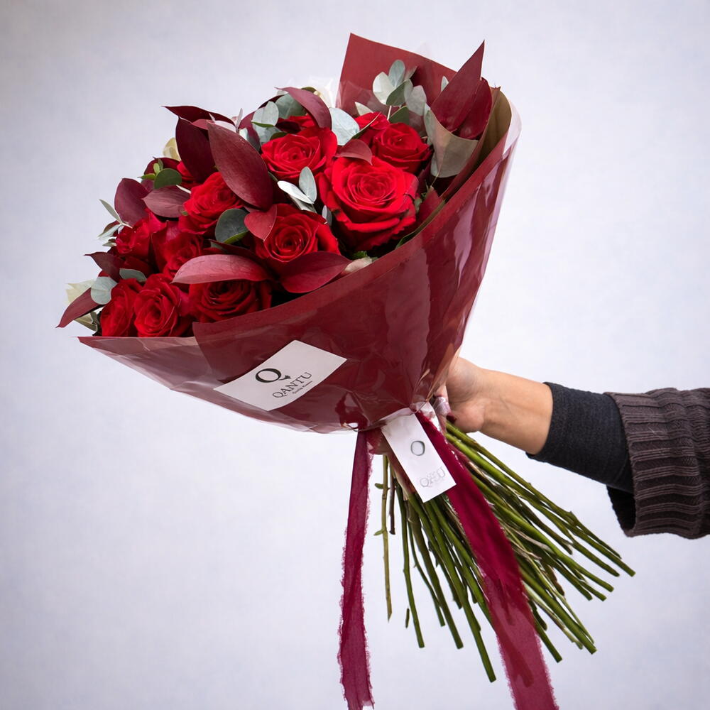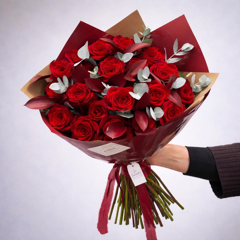 Цей елегантний класичний букет поєднує в собі насичений колір та пристрасть 25 справжніх червоних троянд зі свіжістю та ароматом 14 гілок евкаліпта. Додавання 8 червоних рускусів додає завершального штриха вишуканості та елегантності. Ідеально підходить для особливих моментів або просто для того, щоб скрасити будь-який день. Зверніть увагу, що хоча ми докладаємо всіх зусиль, щоб знайти точні інгредієнти, іноді нашим флористам може знадобитися замінити квітку аналогічною. Кожен букет Qantu Quality Flowers розроблений та виготовлений вручну в нашій майстерні з використанням найкращих квітів від перевірених виробників та постачальників. Ваш букет буде доставлено в подарунковій упаковці.