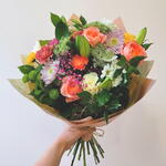 Букет, сповнений енергії та кольору, що викликає радість та свіжість у кожній деталі. Троянди в відтінках лосося та кремові поєднуються з ліловими та білими хризантемами, створюючи яскраву гармонію. Вкраплення зелені та дрібні фуксійні ягідки додають динамізму та сучасності. Ідеально для дня народження, висловлення подяки або щоб прикрасити будь-який простір. Щоб зберегти букет свіжим, поставте його у вазу з чистою водою, міняйте воду кожні два дні та обрізайте стебла по діагоналі. Уникайте прямого сонячного світла та протягів, щоб продовжити його красу.