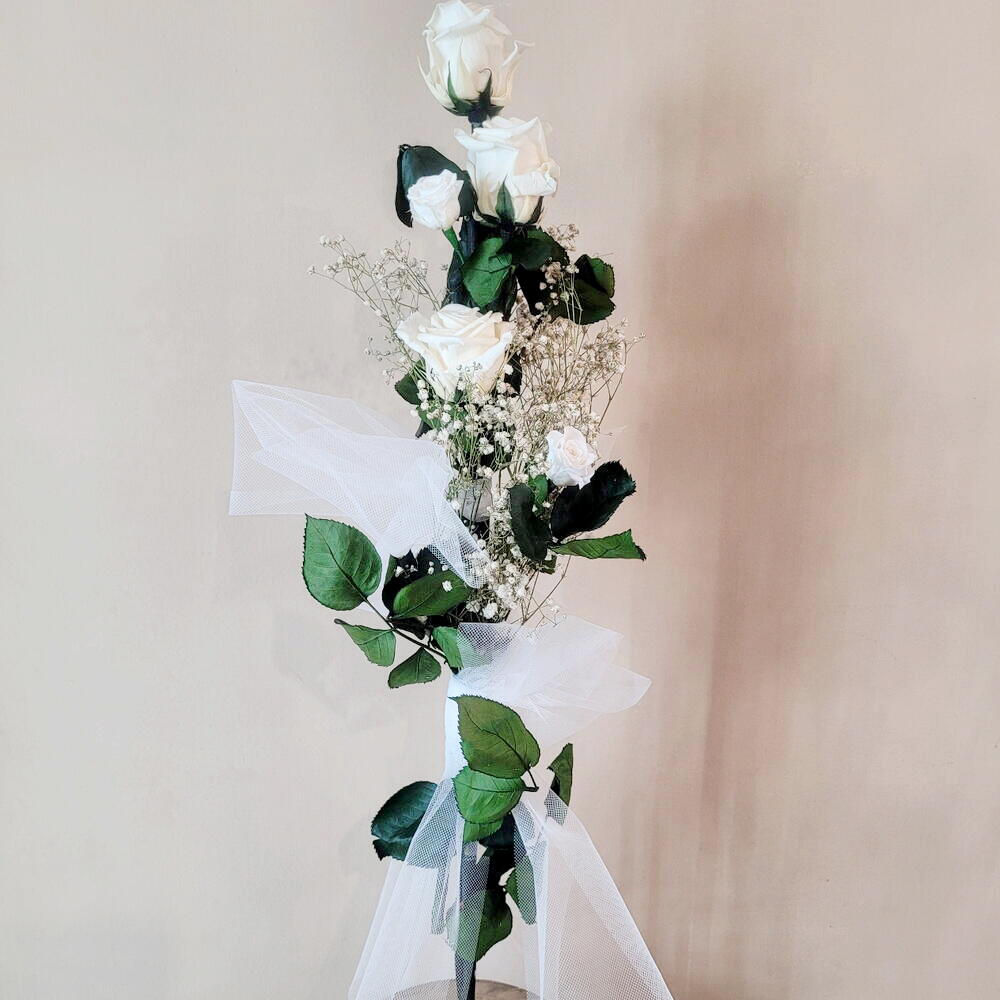 Весільний букет із вічних білих троянд, як каже його назва, тривалість нескінченна й безмежна, а інші означають існування поза часом або поза часовим виміром, букет, який завжди пам'ятатимуть, їх можна зробити в інших кольорах.