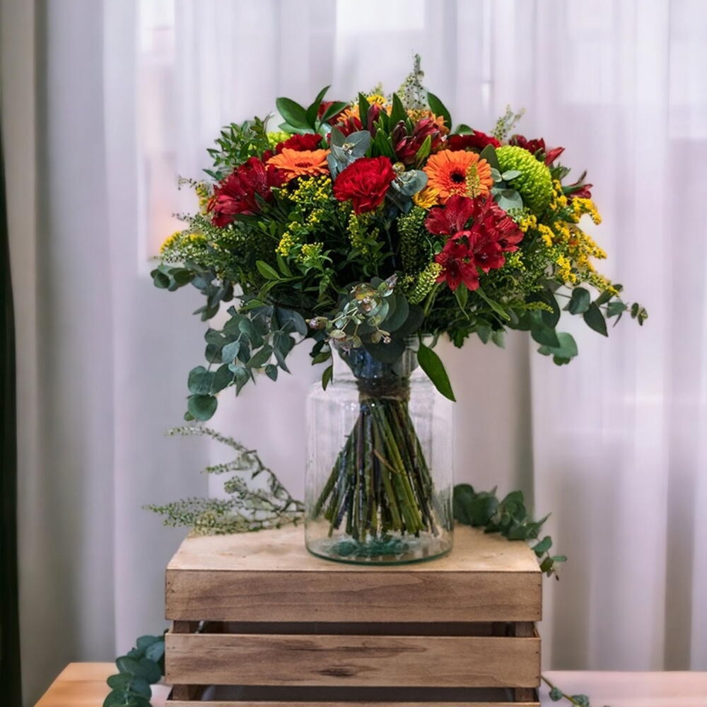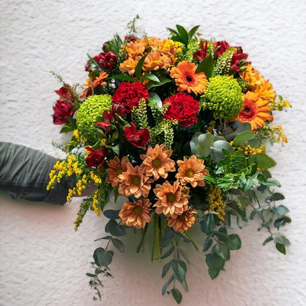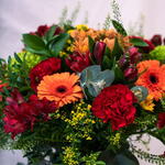 Букет свіжих квітів у осінніх тонах. Квіти : Маргаритки, Альстромерії, Гвоздики, Анастасія, Золотарник і різні види зелені.