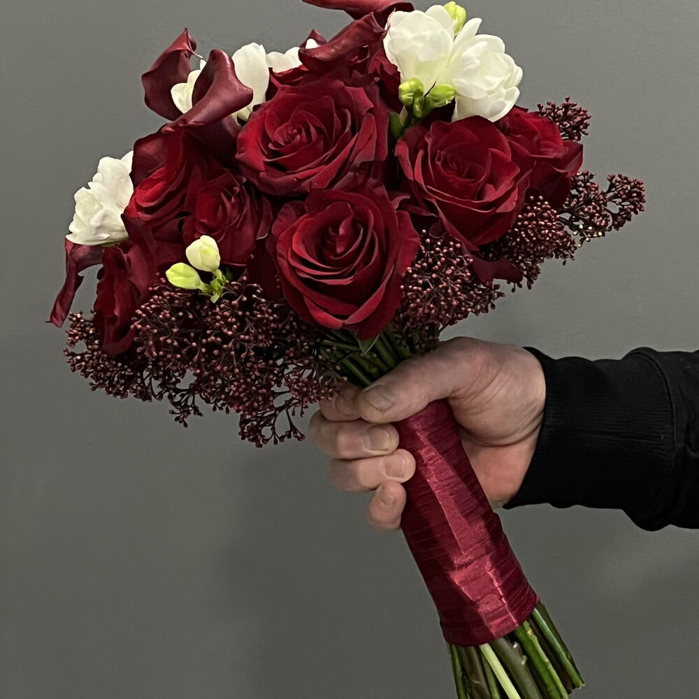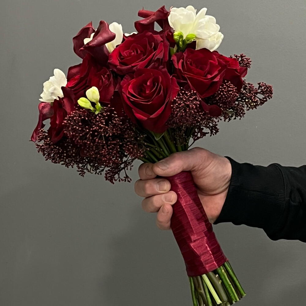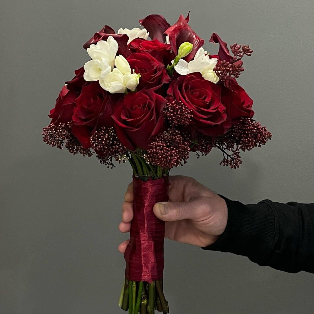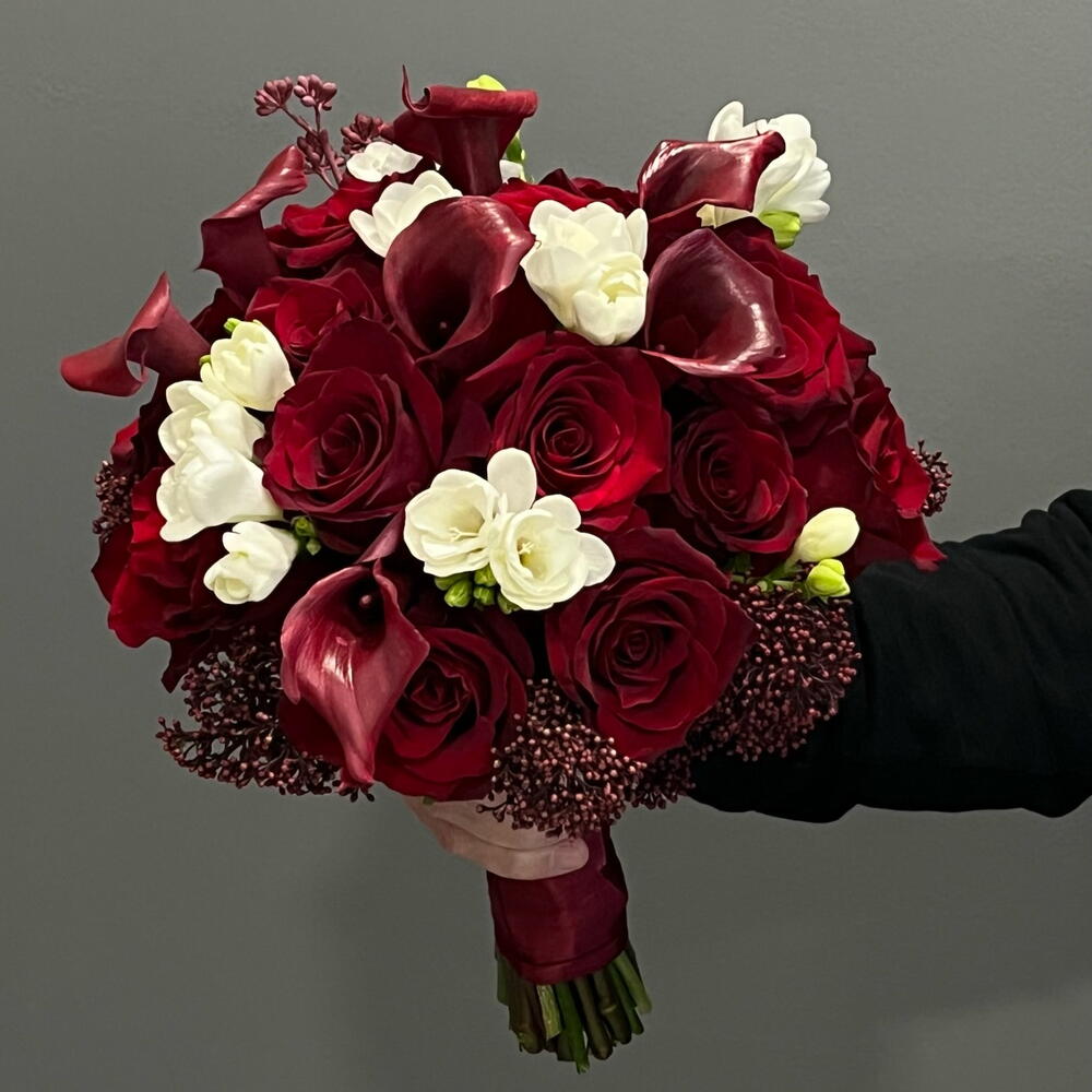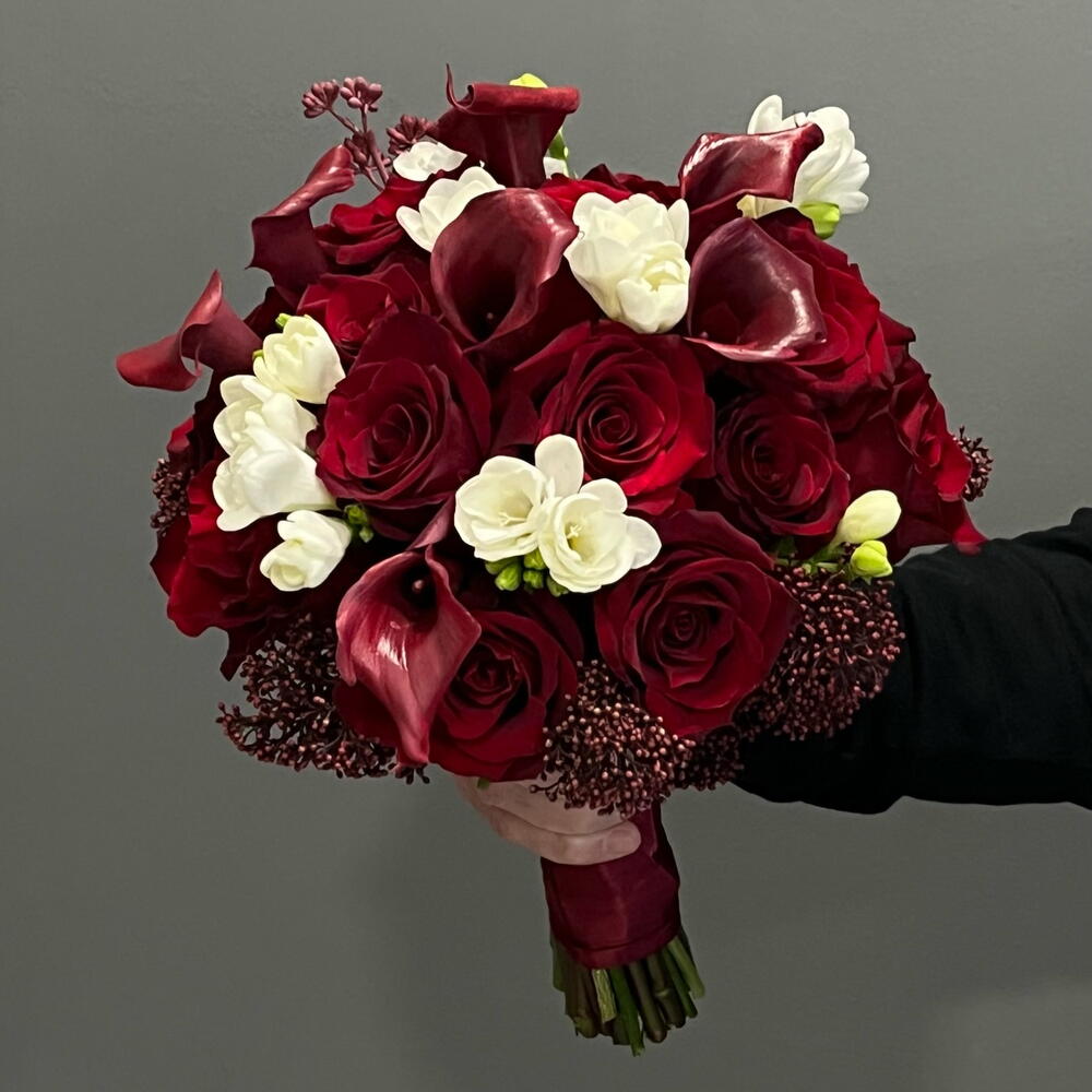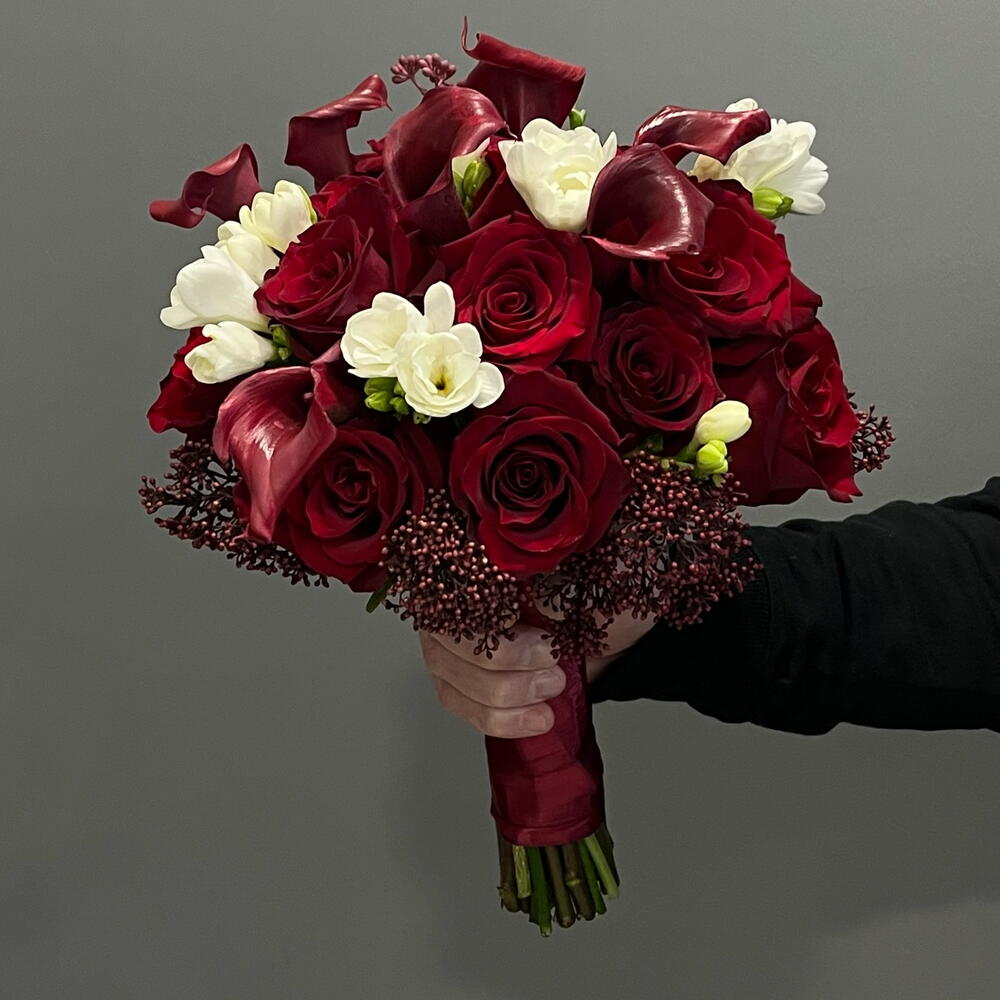 Ексклюзивний букет Рубі: унікальний букет із червоних троянд, елегантних калл та свіжої білої фрезії. Інтенсивний, сучасний і ідеальний, щоб сяяти у свій великий день. Дотик пристрасті та стилю в кожній деталі!❤️🌹 Краще зробити замовлення мінімум за два тижні.