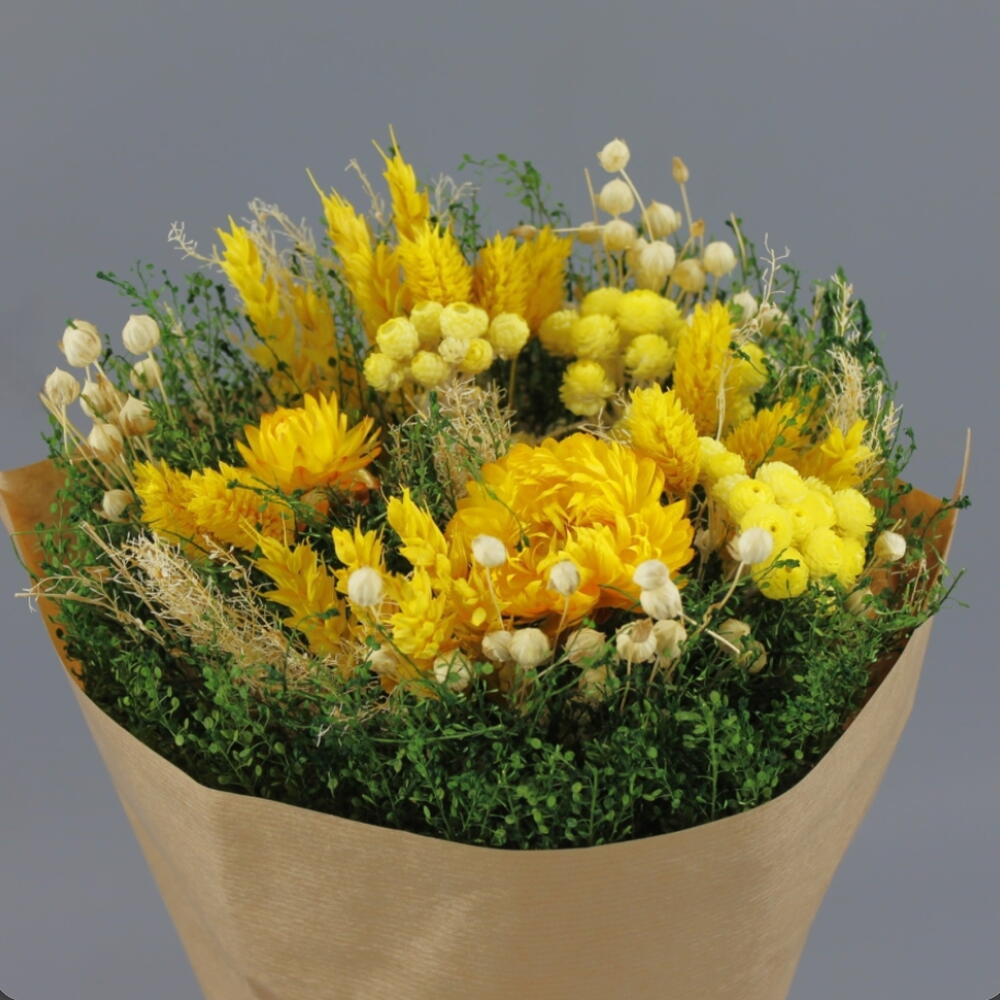Гарний сухий букет у відтінках жовтого з відтінком білого, що надає йому свіжого, сяючого вигляду. Він складається з квітів, оброблених для довговічності, ідеально підходить для композицій, що не потребують особливого догляду та прослужать роками. Жовті квіти включають 4 амаранти, 7 лагурусів яйцеподібних, 4 солідаго та 5 краспедій, з відтінком білого від 3 гіпсофіл, доповнені 5 рускусами та 3 пір'ястими спаржевими папоротями.