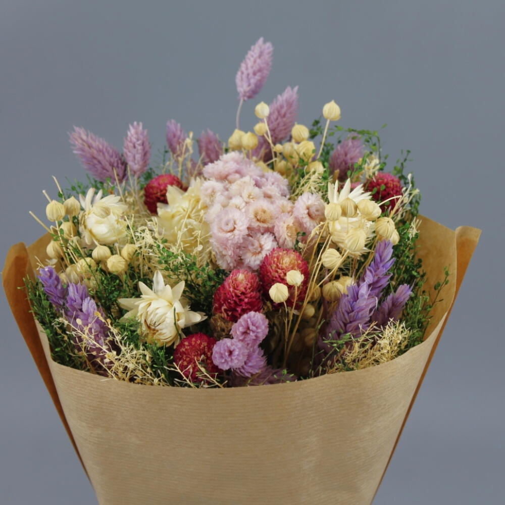 Букет із натурально висушених квітів, оброблених для тривалого збереження краси та догляду, що гарантує їхню свіжість, як у день, коли ви їх зібрали. Він містить різноманітні квіти у відтінках фіолетового, лавандового та бежевого. Букет включає 4 цибулини амаранту, 5 статиць, 7 лагуруса оватуса, 3 гіпсофіли, 4 солідаго, 6 лімоніумів, 2 еритріуми, 5 краспедій, а також 5 рускусів та 3 спаржеві папороті для озеленення.