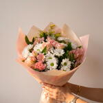 Цей елегантний класичний букет занурить вас в атмосферу елегантності та вишуканості. До складу композиції входять 3 приголомшливі білі ромашки, 4 ніжні рожеві троянди, 3 астромелії, які додають букету нотку природного шарму. Також входять 3 рожеві гвоздики, які ідеально контрастують з 1 білою панікулатою та 1 жовтим солідаго. Щоб завершити образ, букет загортають у 2 елегантні декоративні обгортки. Цей квітковий шедевр ідеально підходить для будь-якої нагоди і безумовно вразить одержувача.
