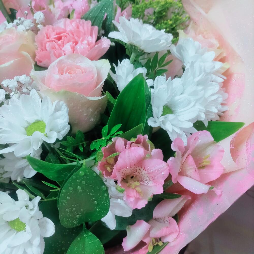 Цей елегантний класичний букет занурить вас в атмосферу елегантності та вишуканості. До складу композиції входять 3 приголомшливі білі ромашки, 4 ніжні рожеві троянди, 3 астромелії, які додають букету нотку природного шарму. Також входять 3 рожеві гвоздики, які ідеально контрастують з 1 білою панікулатою та 1 жовтим солідаго. Щоб завершити образ, букет загортають у 2 елегантні декоративні обгортки. Цей квітковий шедевр ідеально підходить для будь-якої нагоди і безумовно вразить одержувача.