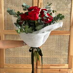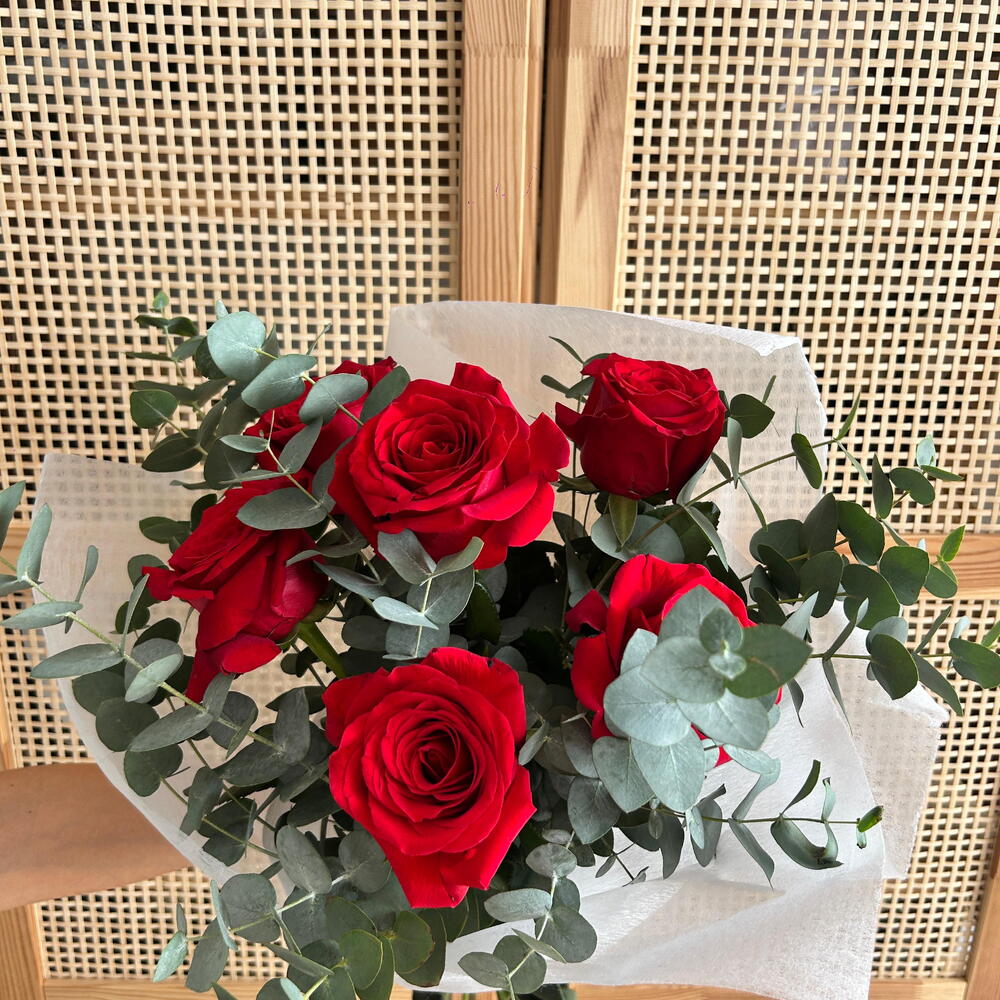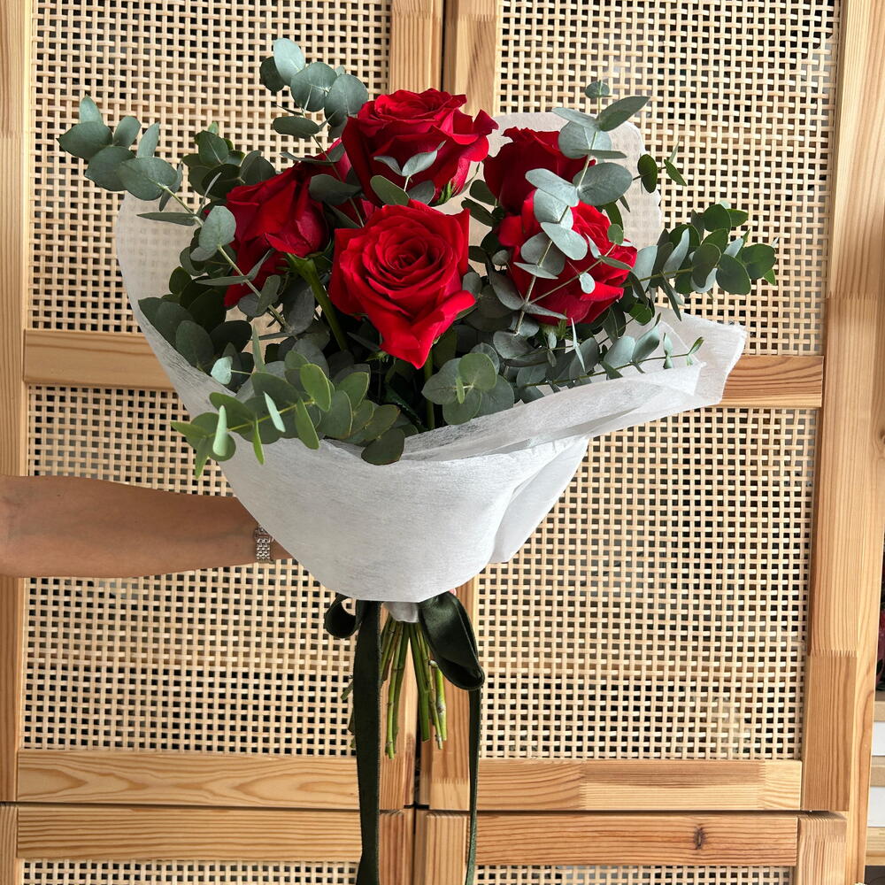 Елегантний та натуральний букет, що складається з насичено-червоних троянд у поєднанні з рясною зеленню евкаліпта, що додає об'єму, свіжості та виразного сучасного стилю. Композиція має повітряну та збалансовану структуру, загорнута у світлий папір, який підкреслює контраст між насичено-червоним кольором квітів та ніжними зеленими тонами. Цей букет стане ідеальним подарунком для жінки, букетом на день народження, романтичною квітковою композицією або квітами для будь-якої особливої події. Ексклюзивний букет із сучасною, але водночас сільською естетикою, ідеальний як сучасна квіткова прикраса та вишукана деталь, що передає пристрасть, елегантність та природну красу.