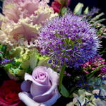 Eustoma - 2 шт. Limonium - 2 шт. Brassica - 1 шт. rosa - 8 шт. allium - 1 шт. clavel - 1 шт. міні гортензія - 2 шт.