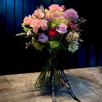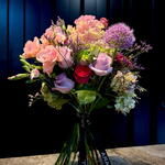 Delicado ramo de autor en tonos pastel, compuesto por rosas frescas, lisianthus, clavel, crisantemo, hortensia y flores decorativas de temporada. Ligero, elegante y muy armonioso, perfecto para cumpleaños, felicitaciones o un detalle especial. El ramo está diseñado en un estilo moderno y transmite ternura y alegría. Posibilidad de añadir una tarjeta con su mensaje personalizado.