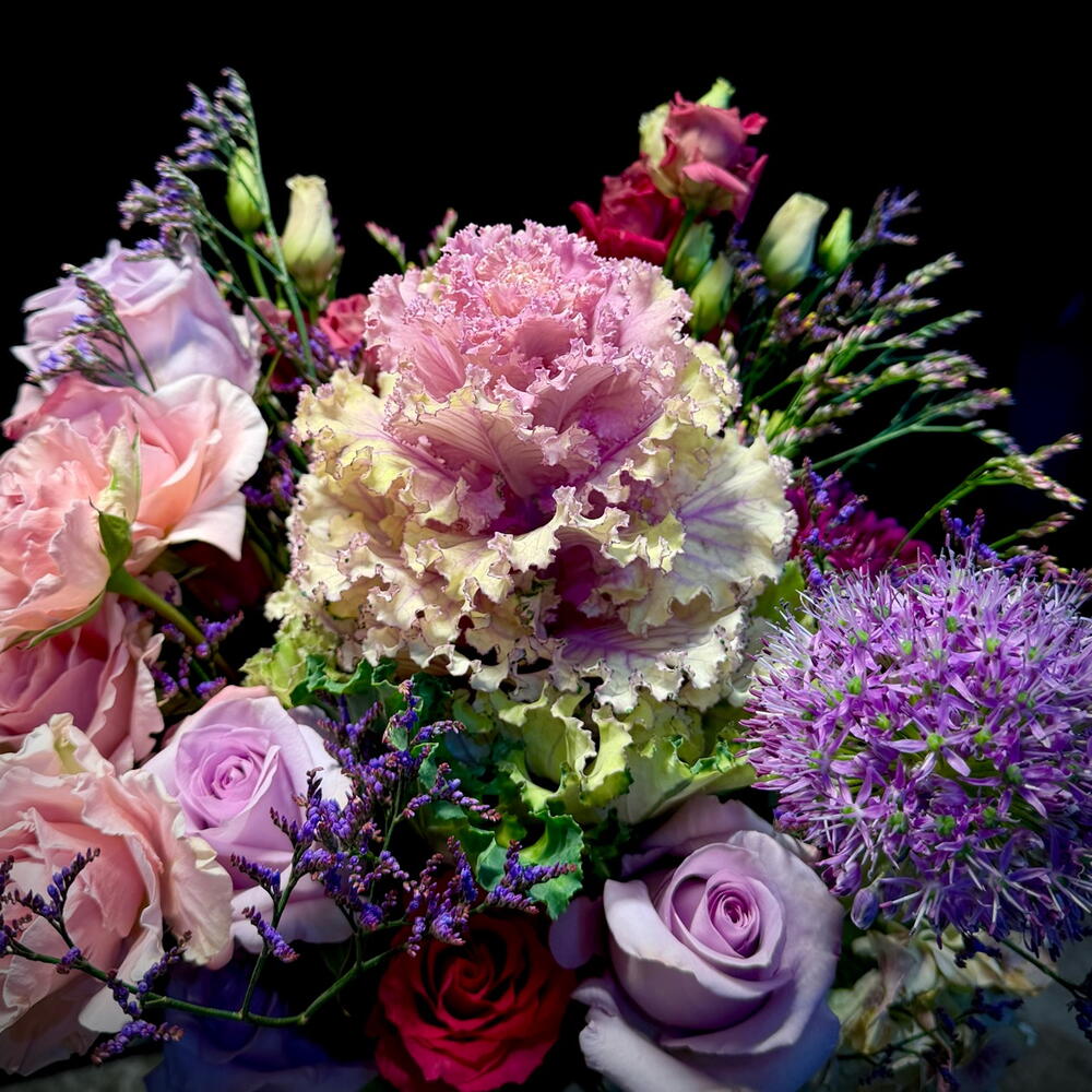 Eustoma - 2 шт. Limonium - 2 шт. Brassica - 1 шт. rosa - 8 шт. allium - 1 шт. clavel - 1 шт. міні гортензія - 2 шт.