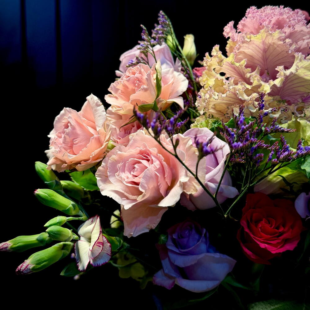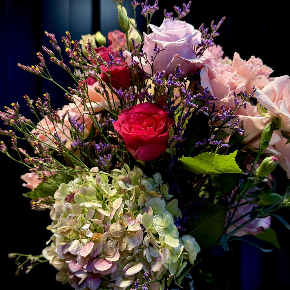 Delicado ramo de autor en tonos pastel, compuesto por rosas frescas, lisianthus, clavel, crisantemo, hortensia y flores decorativas de temporada. Ligero, elegante y muy armonioso, perfecto para cumpleaños, felicitaciones o un detalle especial. El ramo está diseñado en un estilo moderno y transmite ternura y alegría. Posibilidad de añadir una tarjeta con su mensaje personalizado.