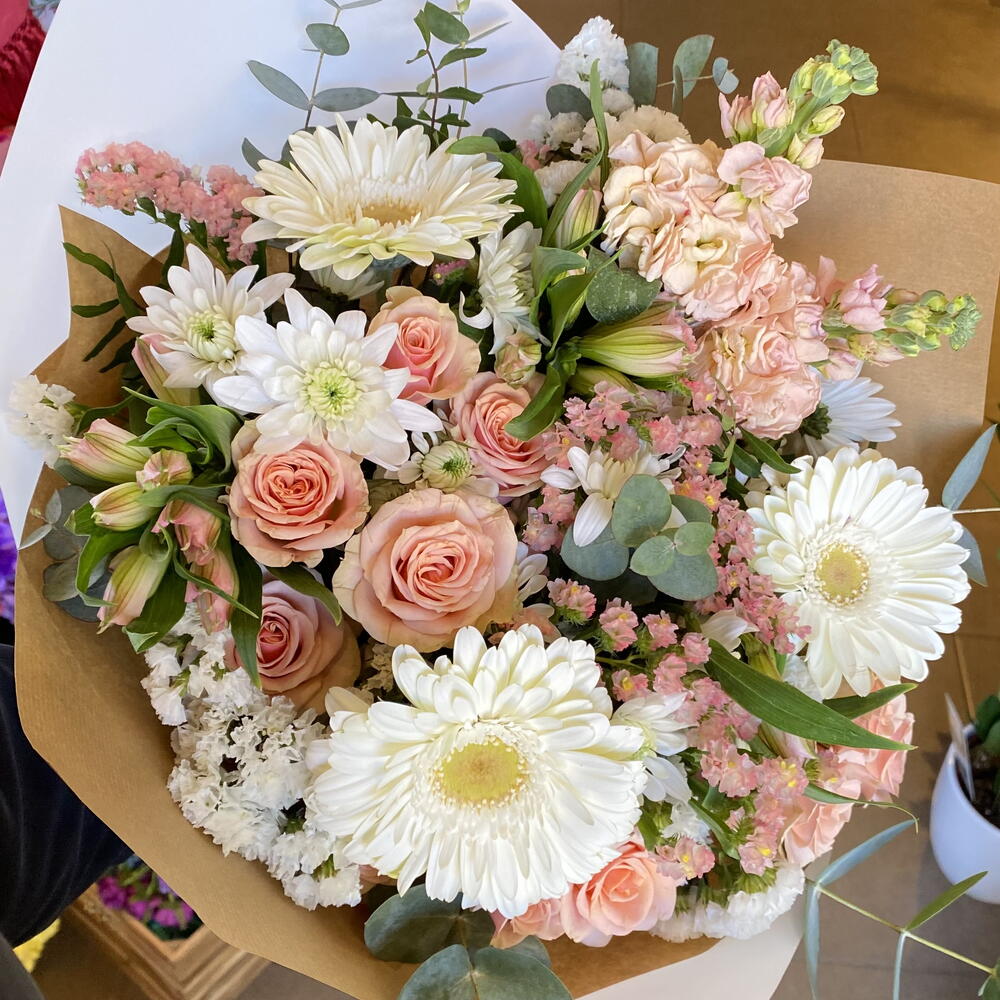 Descubre la auténtica belleza natural con nuestro ramo clásico. Compuesto por 5 ud. de encantadora Statice, 2 ud. de exquisita Alstroemeria, 3 ud. de brillantes Gerberas, 1 ud. de delicada rosa spray, 3 ud. de preciosas margaritas y 2 ud. de elegantes alhelie. Un arreglo perfecto que combina variedad, color y estilo, y seguramente traerá un toque de alegría y sofisticación a cualquier espacio.