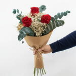 Букет червоних троянд з гілочкою бебі-сапуна та евкаліптом Цей букет червоних троянд – позачасова класика, яка ніколи не підводить. Складений із трьох свіжих червоних троянд, білої гілочки бебі-сапуна та гілочок евкаліпта, він поєднує в собі інтенсивність, ніжність та свіжість у збалансованому та дуже елегантному дизайні. Червоні троянди символізують кохання та пристрасть, тоді як гілочка бебі-сапуна додає легкості, а евкаліпт надає натурального та ароматного відтінку, який завершує композицію. Це ідеальний букет для подарунка на річниці, День святого Валентина, дні народження або для вираження почуттів простим та особливим способом. Букет виготовлено вручну в нашій флористічній майстерні зі свіжих, високоякісних квітів та подається ретельно загорнутим, готовим до вручення. 🌹 Простий, елегантний та змістовний подарунок. Доставка додому доступна.
