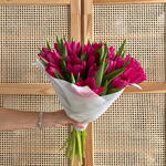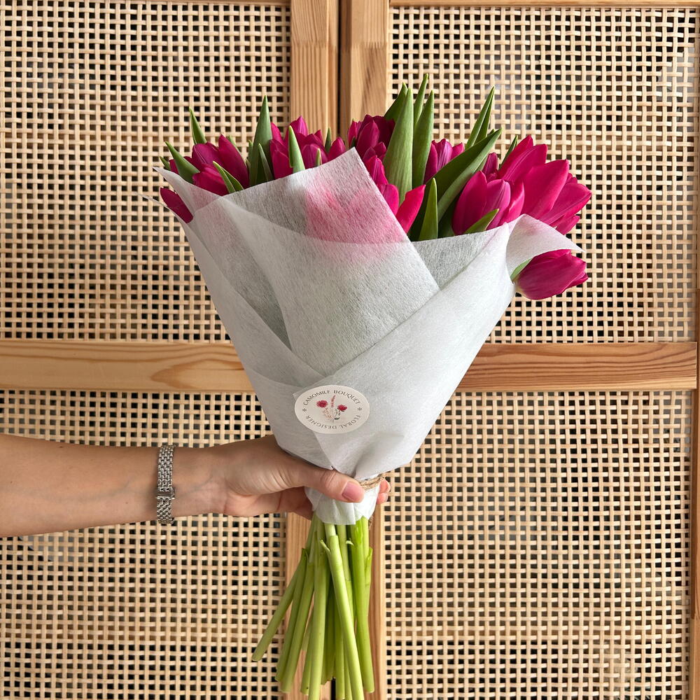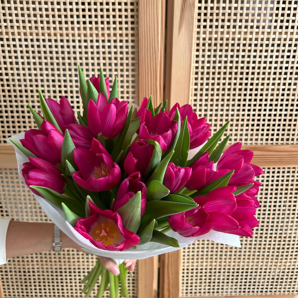 Візуально вражаючий букет яскравих тюльпанів кольору фуксії, компактно та гармонійно розміщених, створюючи вражаючу та елегантну композицію. Різноманітна зелень, утворена натуральним листям тюльпанів, додає букету об'єму, свіжості та динамічної структури. Загорнутий у сучасний світлий папір, цей елегантний букет ідеально підійде як подарунок жінці, на день народження, унікальний подарунок або квіти для будь-якої особливої події. Романтична та сучасна квіткова композиція, ідеально підходить як сучасне квіткове оформлення, вона передає енергію, вишуканість та виразний квітковий характер.