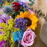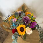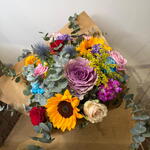 Цей чудовий дизайнерський букет включає поєднання соняшників (2), троянд (5), капустяних (1), гвоздик (4), хризантем (2), жовтого льоду (1), жовтого солідаго (2) та завершальний штрих з евкаліпта (6) та синеголовника (1). Поставлений у скляній вазі, він додає елегантності композиції. Букет, що символізує дружбу, кохання та щастя, ідеально підходить для того, щоб здивувати когось з будь-якої нагоди.