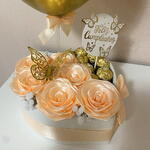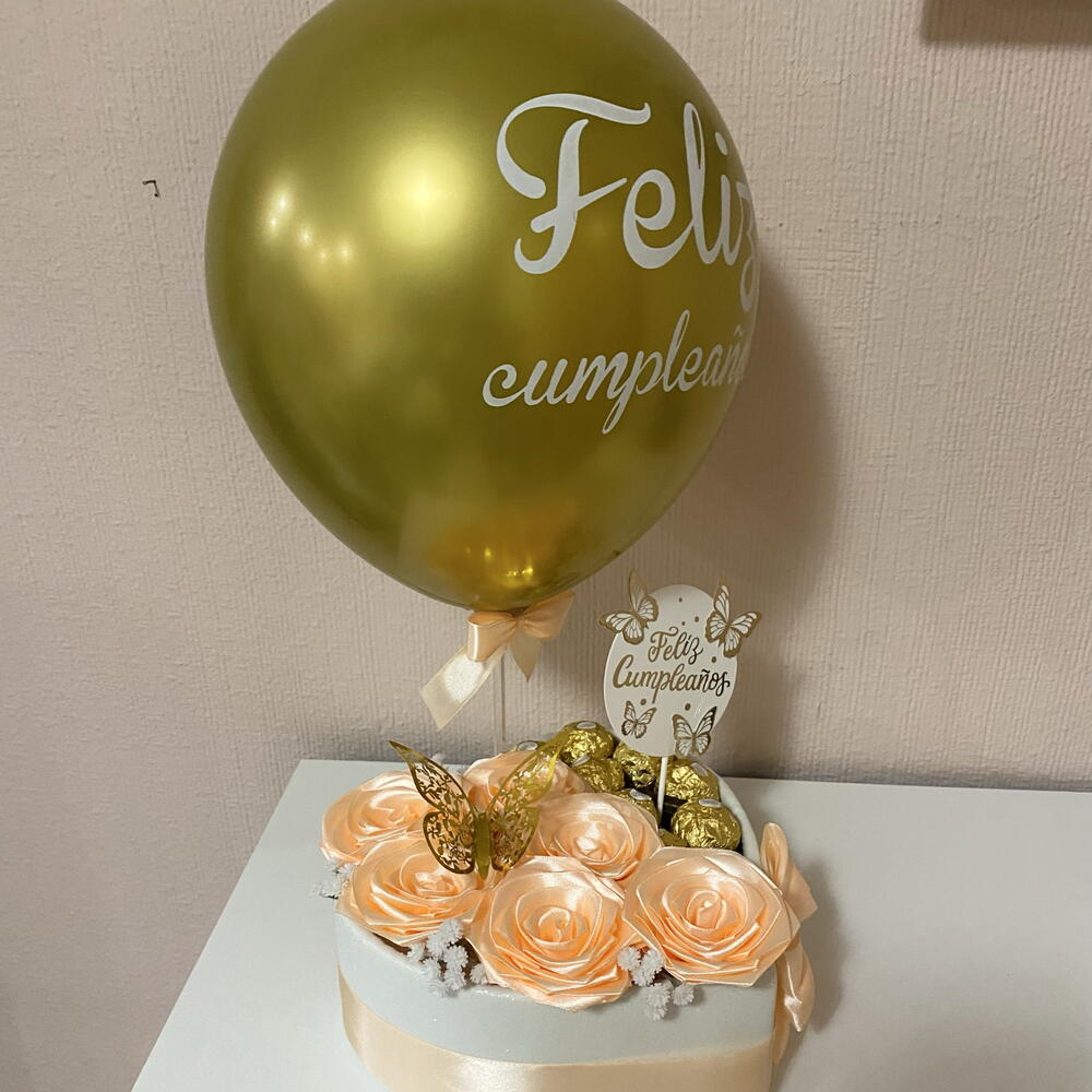 Ferrero rocher - 9 шт. коробка у формі серця - 1 шт. декоративний метелик - 1 шт. повітряна кулька з днем народження - 1 шт. вічні троянди - 6 шт. топпер з днем народження - 1 шт. маленькі білі штучні квіти - 4 шт.