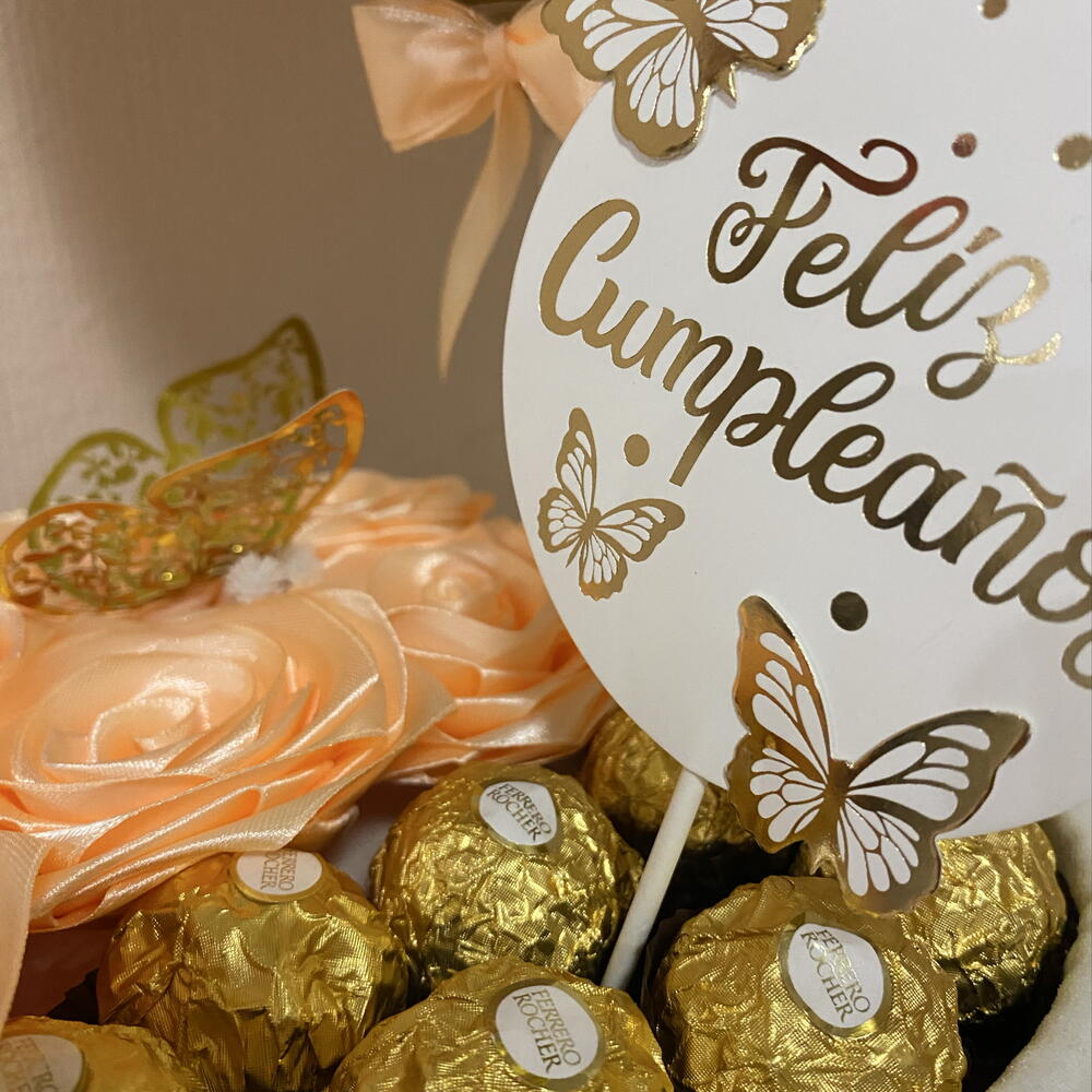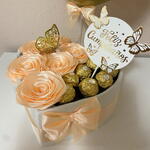 Шовковиста, блискуча троянда, яка ніколи не в'яне – символ вічних почуттів Ідеальний подарунок на день народження; вам не потрібно купувати нічого більше. Він містить усе необхідне, щоб зробити день особливої людини яскравішим. Унікальний, повністю ручної роботи. 6 атласних троянд персикового кольору ручної роботи з 9 шоколадними цукерками Ferrero Rocher створюють елегантну та візуально приголомшливу композицію. Ідеально підходить для: - друга - колеги, колеги по роботі - мами - або будь-якої особливої людини з турботливим та люблячим жестом Має 9 високоякісних шоколадних цукерок Ferrero Rocher. Склад: молочний шоколад, фундук, цукор, рослинна олія (пальмова), пшеничне борошно, молочні продукти, какао-порошок, соєвий лецитин, розпушувач, сіль та ароматизатори. Алергени: молоко, фундук, глютен та соя.
