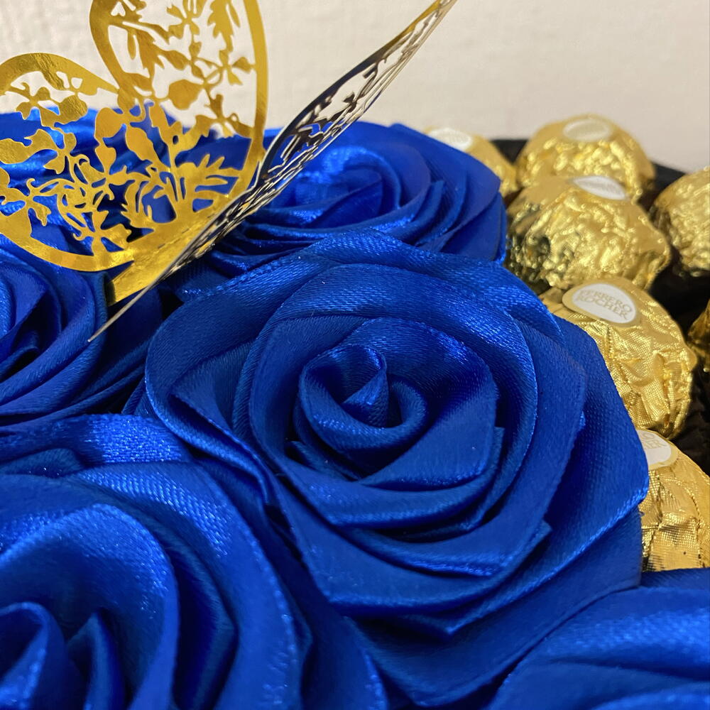 Унікальний подарунок, ручної роботи! Ексклюзивна композиція, де 6 вічних троянд ручної роботи з сатину та 9 преміум-цукерок Ferrero Rocher поєднуються в ідеальній гармонії. Елегантний і незвичайний подарунок, що дивує з першого моменту. Комбінація синіх троянд ручної роботи та Ferrero створює сучасну й вишукану деталь. Ідеально для днів народження, річниць або щоб здивувати чоловіка чимось справді особливим.