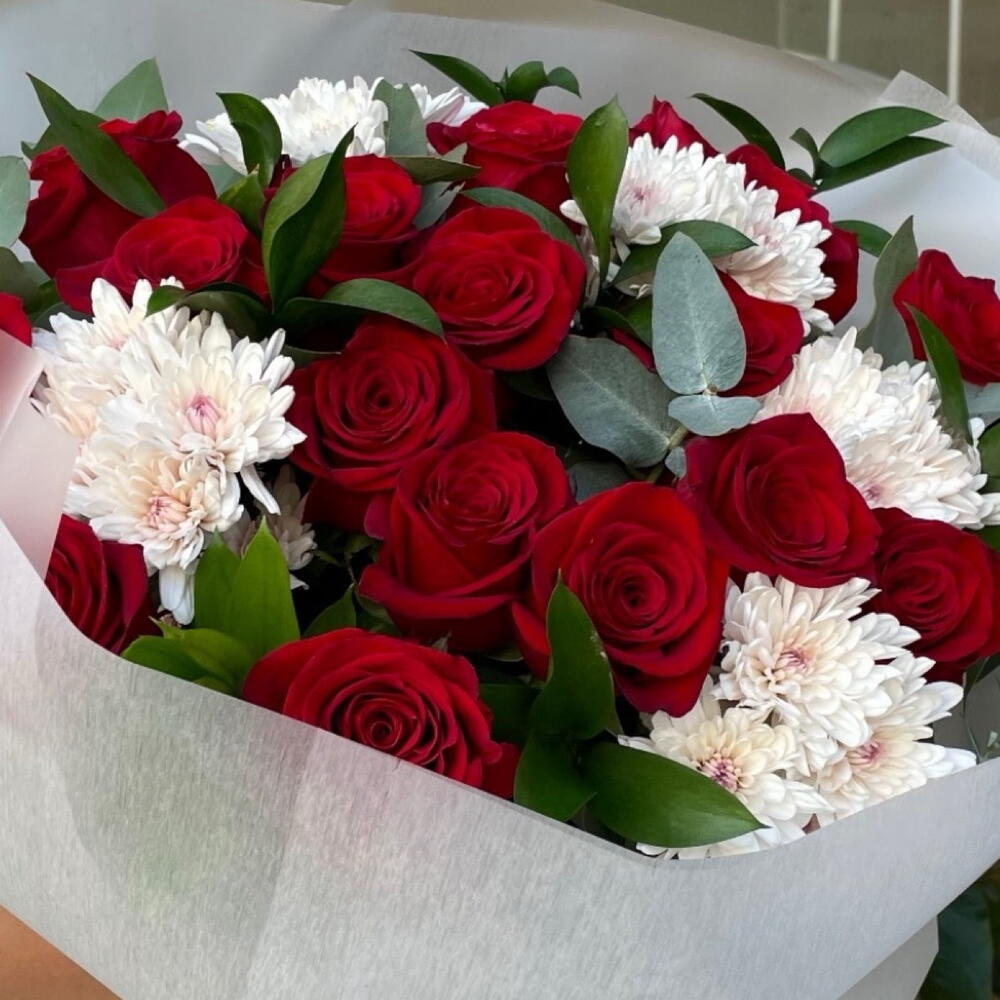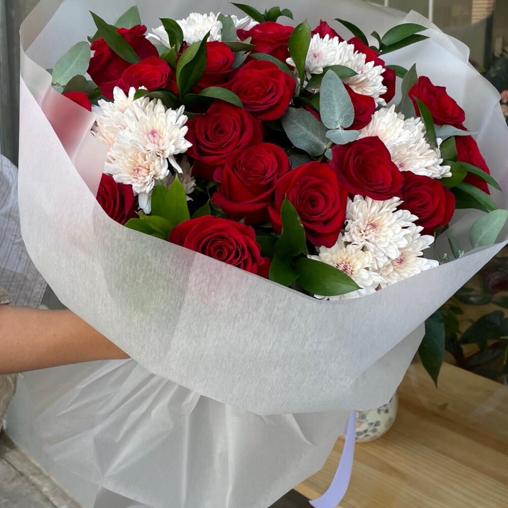 Рускус - 10 шт. Евкаліпт - 7 шт. Red rose - 21 шт. packaging design - 2 шт. хризантема - 5 шт.