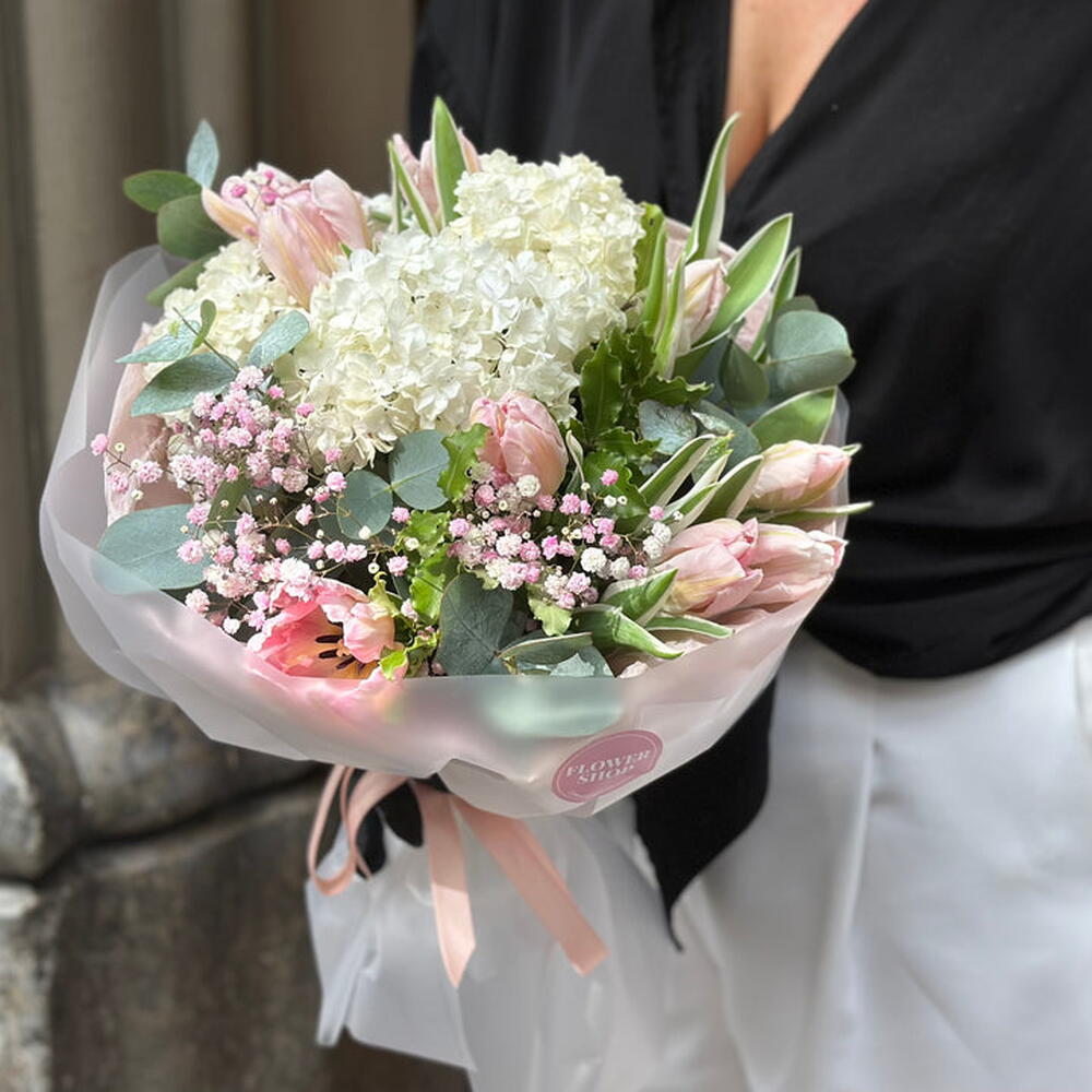 eucalipto - 3 шт. білі гортензії - 3 шт. рожеві тюльпани - 10 шт. гілочки гіпсофіли - 3 шт.