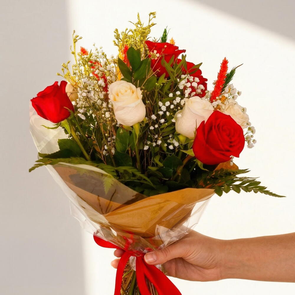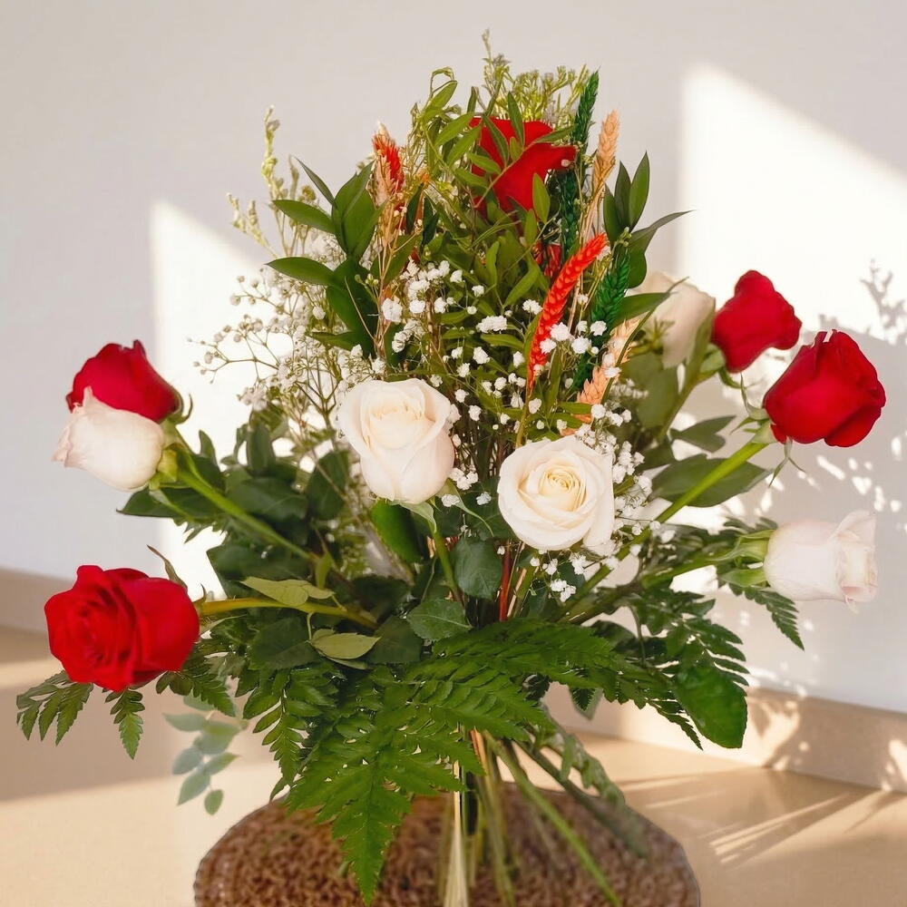 rosas rojas - 6 шт. rosas blancas - 6 шт. verdes variados - 5 шт.