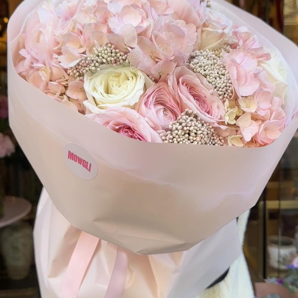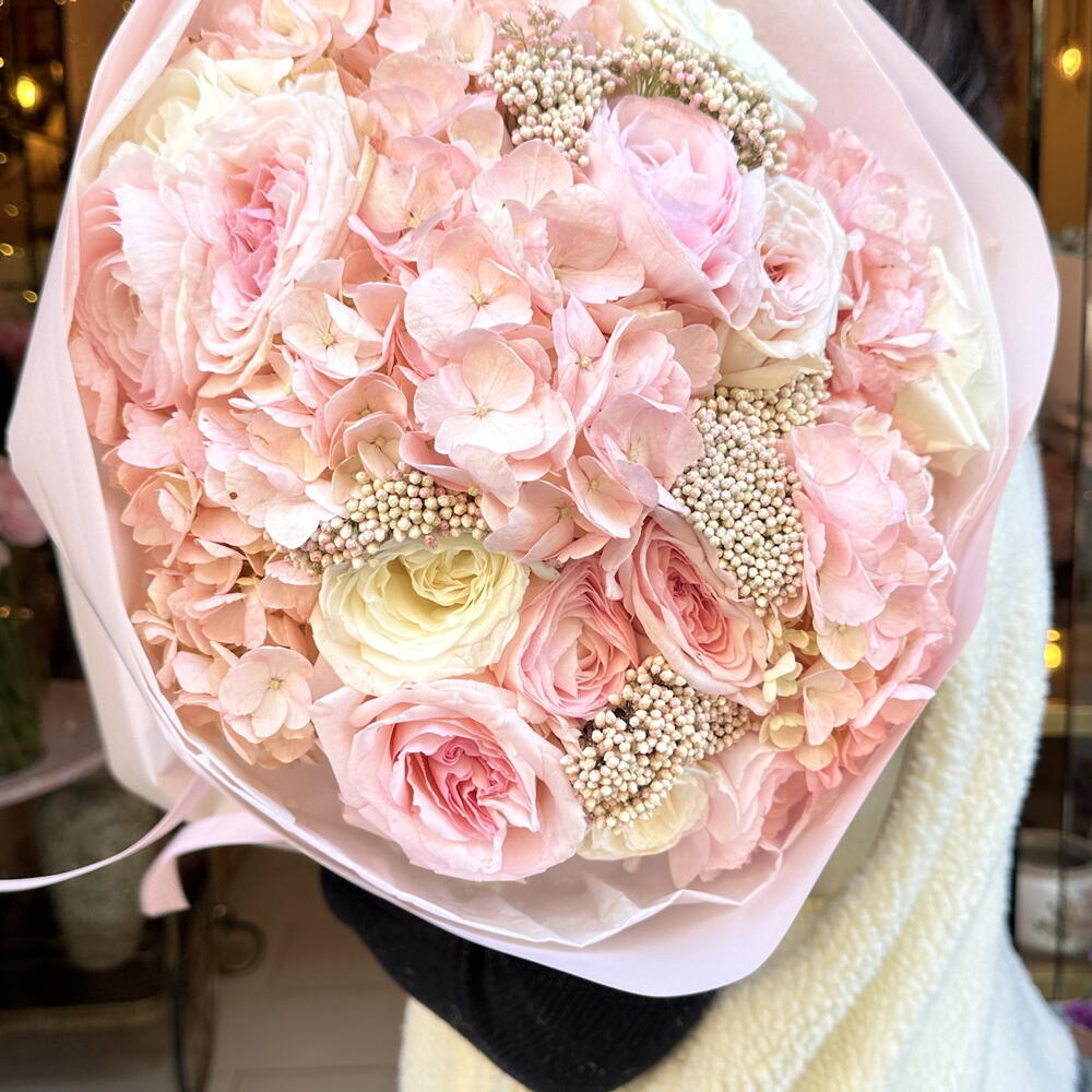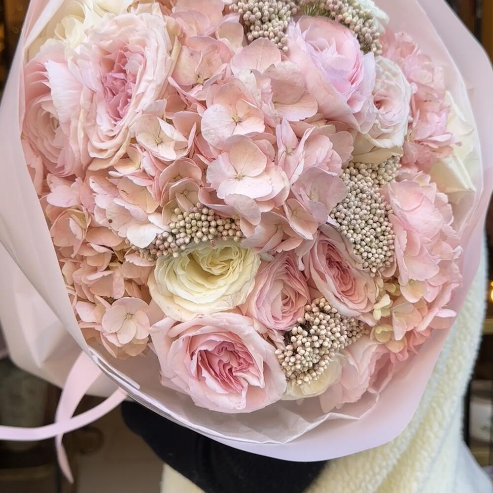 Spray rose - 2 шт. Hydrangea - 5 шт. rosa - 6 шт. ranúnculo - 4 шт. квітка рису - 5 шт.